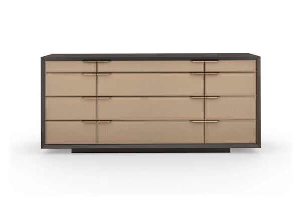 Merging minimalism with elements of mid-century modern, this streamlined dresser introduces a sophisticated style to bedroom interiors. Each drawer front is wrapped in a beautifully textured vinyl, embossed with a rivulet pattern like rain trickling down a windowpane. Casting a warm glow, metal trim in Champagne Gold artfully incorporates rounded pulls to seamlessly frame each drawer. Offers generous storage with soft-closing features and two felt-lined top drawers for an added note of luxury.