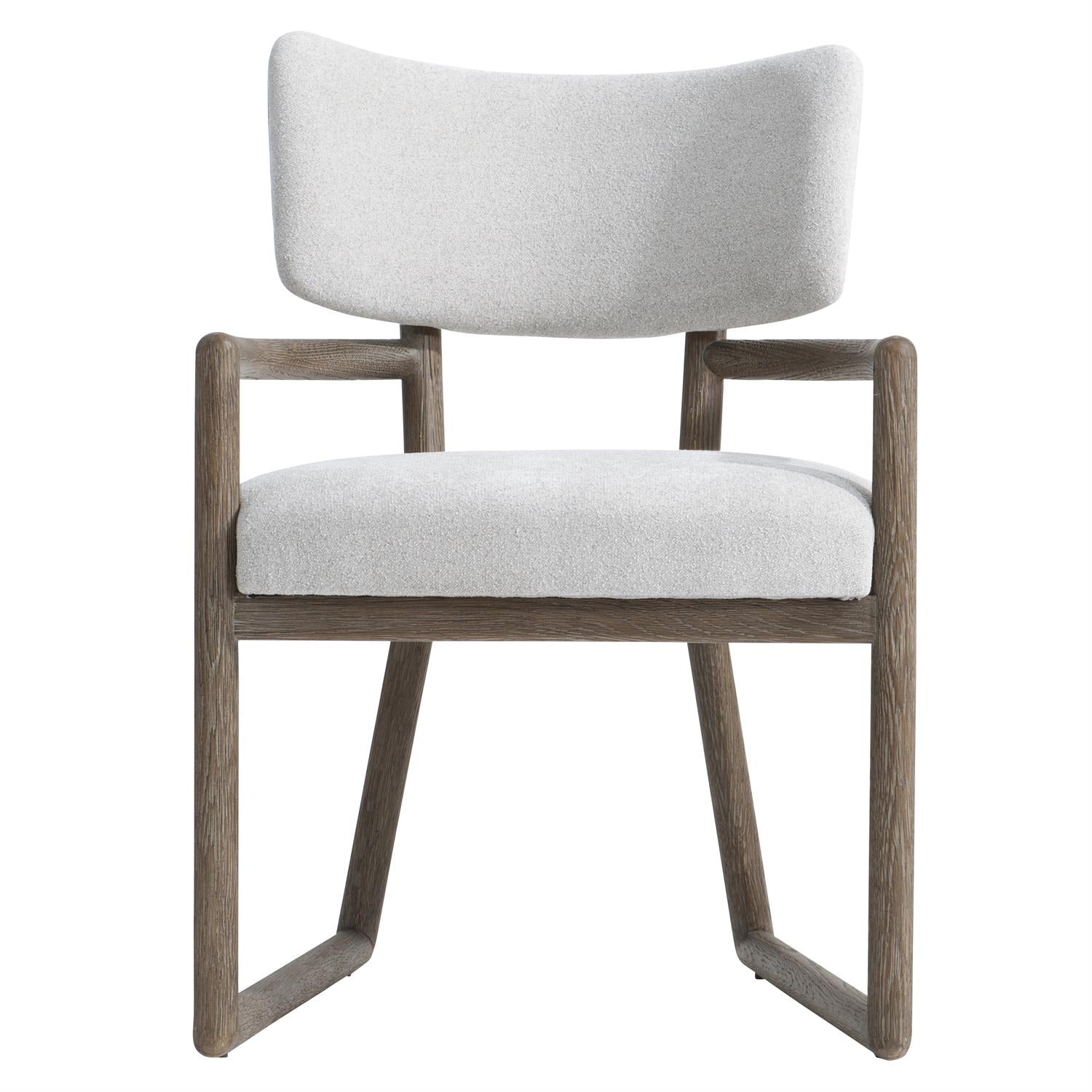 The Casa Paros arm chair features an entrancing geometric design, expertly crafted with bold shaping. The exposed wood frame, finished in Playa, provides sturdy support for the gracefully curved and upholstered floating back and seat. With its sleek and minimalistic look, this chair exudes sophistication.