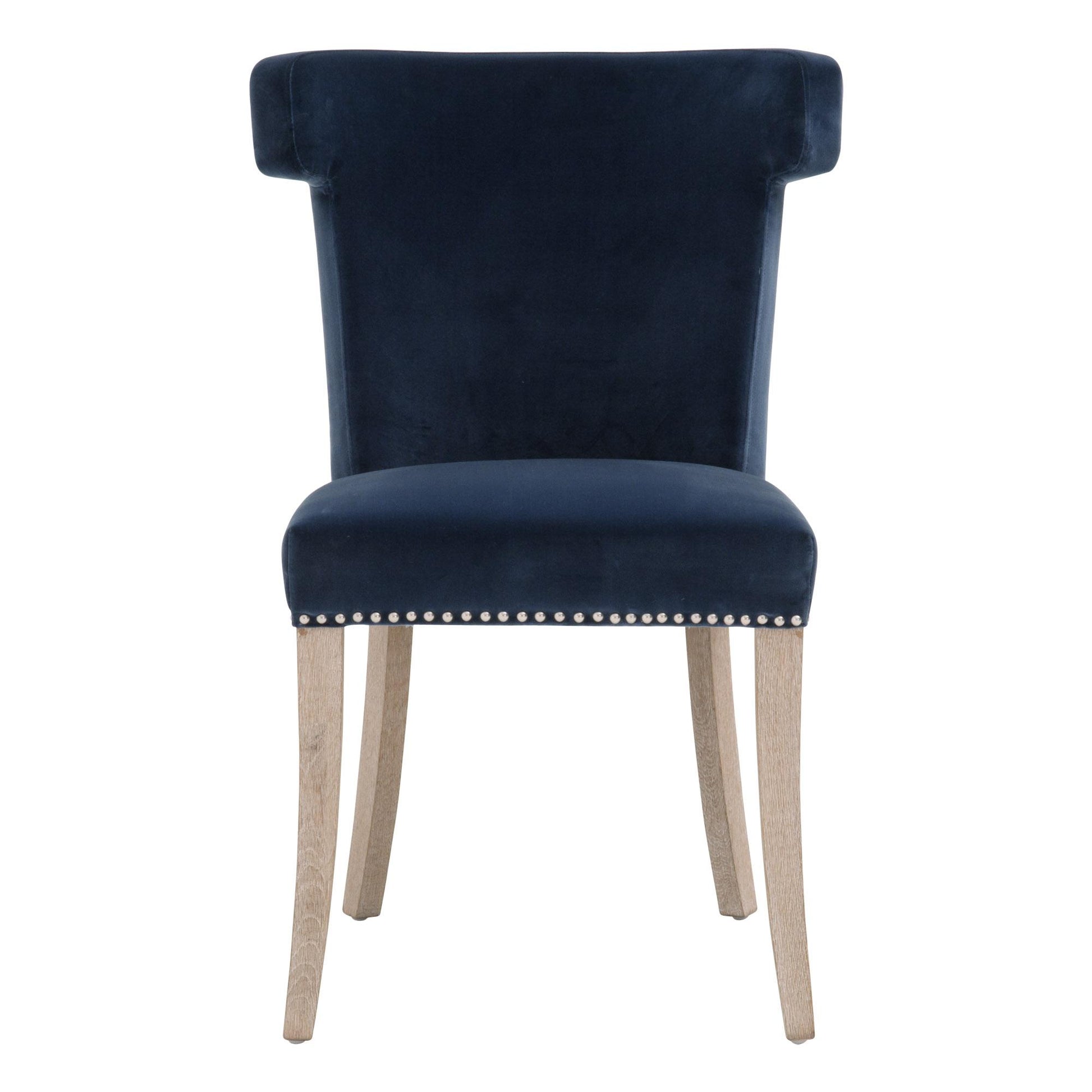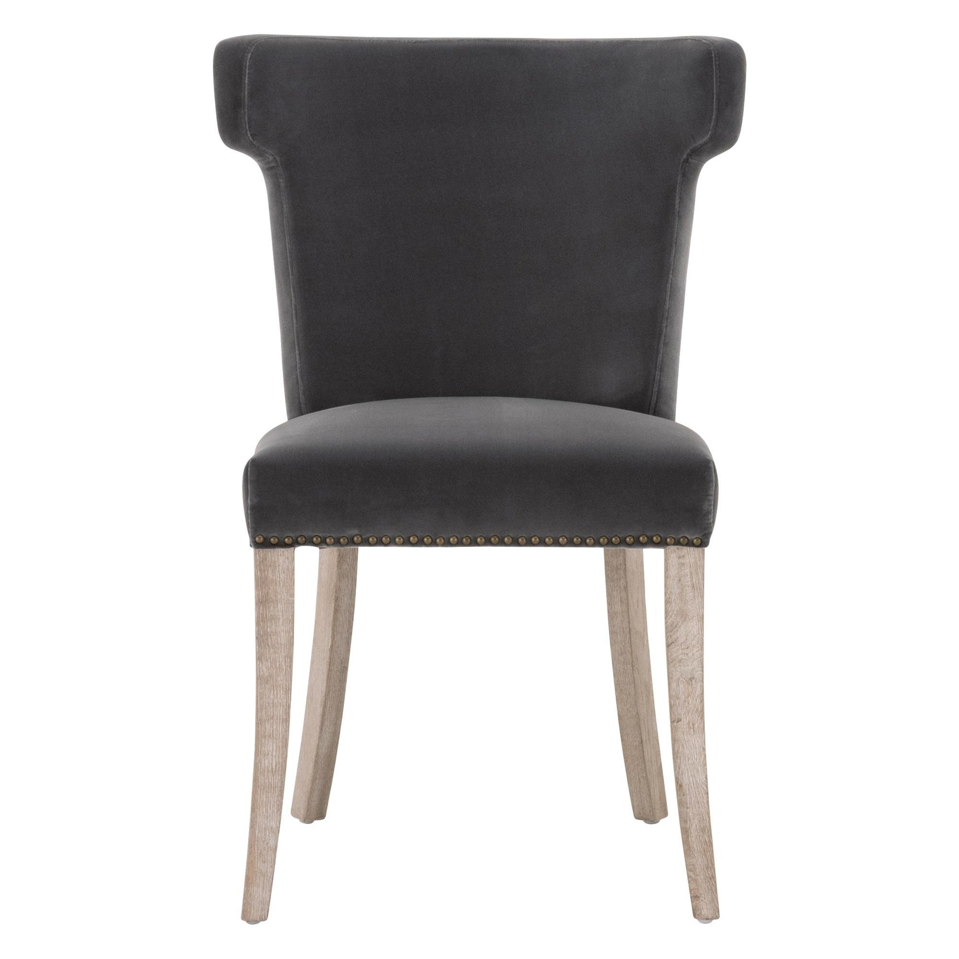 Complete your dining set with the elegant Celina Dining Chair . It measures 24.5 inches wide, 24 inches deep, and 37 inches high, with a 20.5 inches seat height. The dark gray velvet upholstery is rich in color and will make this chair the standout piece of your dining set. It is constructed with a uniquely sculpted wingback and natural gray oak legs. Gold nail heads line the base of the seat and back of the chair, adding modern appeal to this beautiful dining chair. This side chair will pair nicely with many transitional style dining tables, kitchens, and dining rooms.