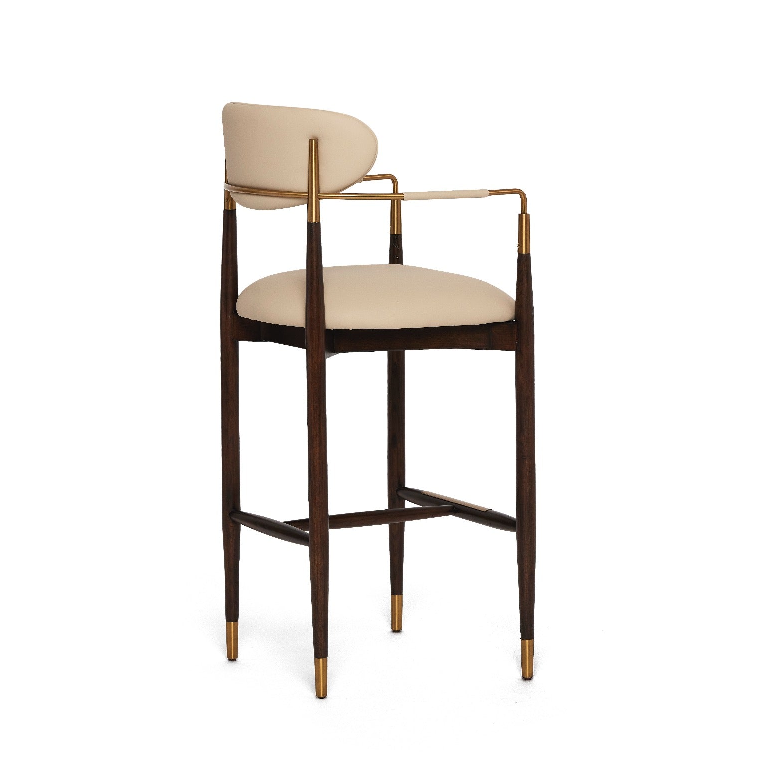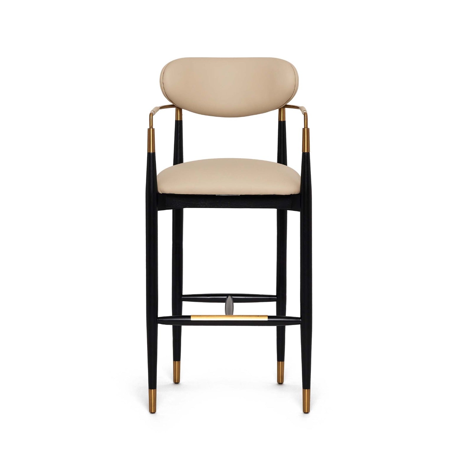 The Cidra Bar Stool merges refined aesthetics with thoughtful material selection. Its matte black ash frame pairs seamlessly with polished stainless-steel accents and sumptuous cream latte vegan leather upholstery, creating a striking composition that elevates any bar or kitchen counter with understated elegance and contemporary flair.