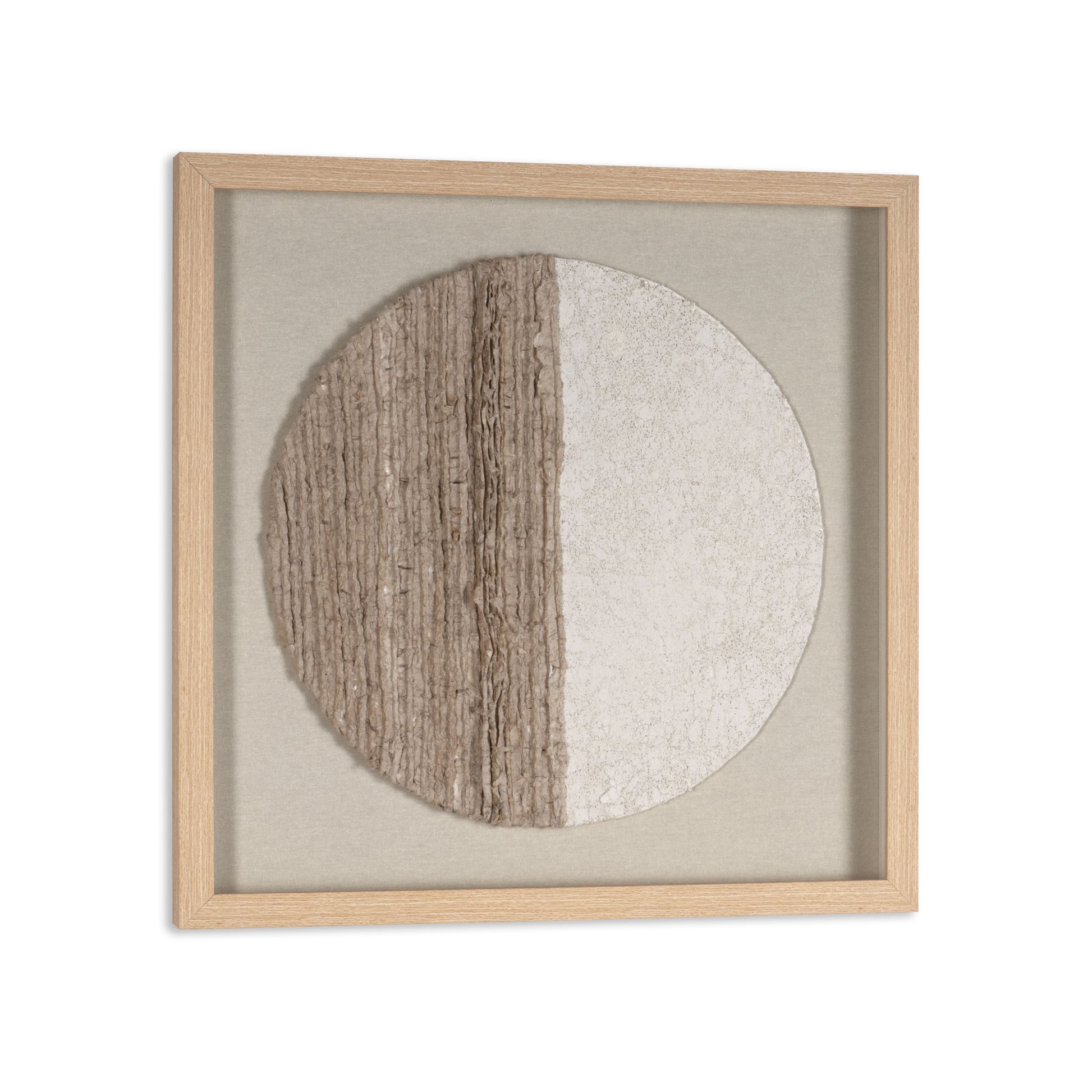 The 24" x 24" shadow box features two contrasting textures side by side within a neutral color palette. Made using hand laid paper pulp, the textures are visually intriguing as it plays with light and shadow, potentially evoking various interpretations or emotions from the viewer. The polycomposite frame radiates a sense of warmth and richness, enveloping the artwork in a subtle elegance, all beautifully showcased behind glass. The piece’s exploration of tactile qualities within a minimalist approach can make a powerful statement in any room setting.