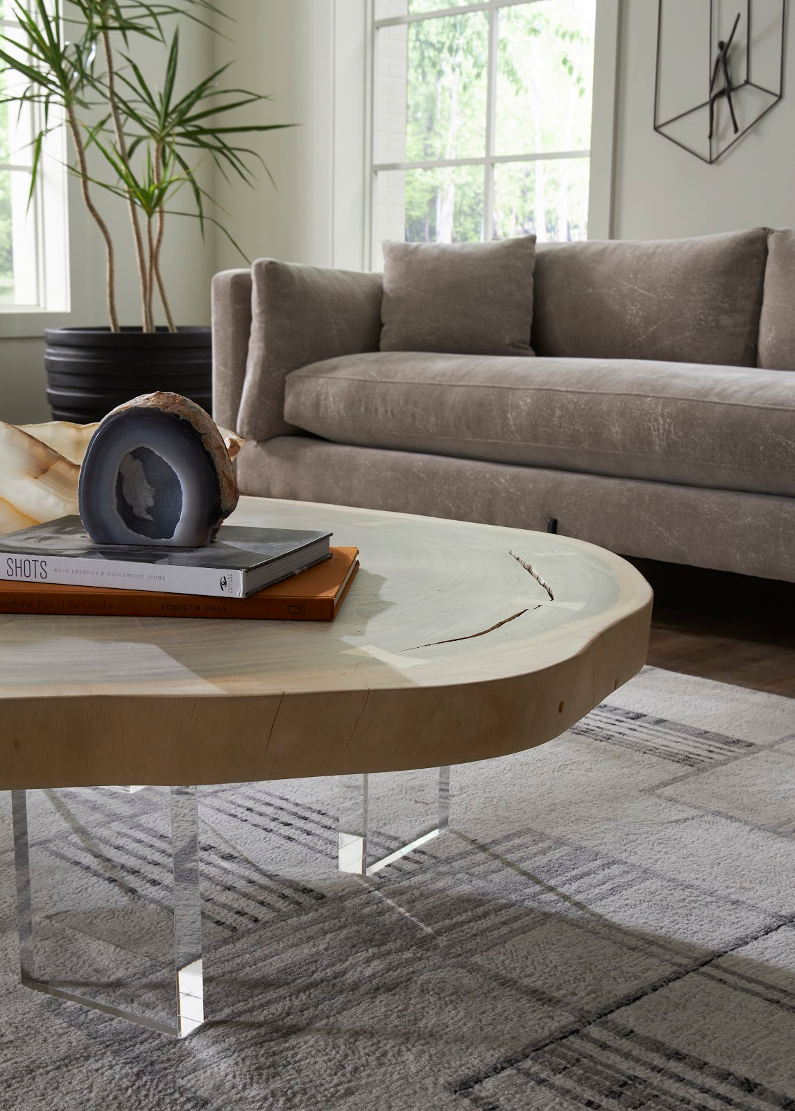With acrylic legs that all but disappear, the plank top of our Floating Large Natural Coffee Table seems to levitate. Made of chamcha wood that we have left natural, the top has tremendous personality given the beautiful color gradations in the woodgrain, which has a textural complexity to it. We offer the Floating tables in a number of finishes, including natural and gray, and sizes, including console tables, side tables, and coffee tables—several with organic edges that mimic the shapes of the original trees. Each of the offerings in this collection reflects the ethos that Phillips Collection personifies: modern organic.