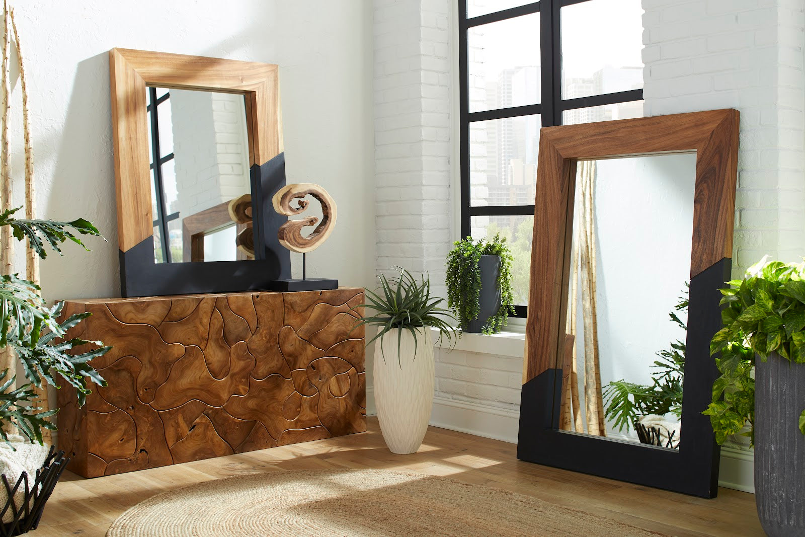 Playing around with shapes is one of the main implements in our tool kit at Phillips Collection. In combining the deepest black and natural wood on slant, as we have with our Geometry Large Natural Mirror, we’ve created a sophisticated profile that brings organic warmth and contemporary cleanness to a space. The surface variations of the woodgrain also bring texture into a room. We have a wide array of shapes in coffee tables, console tables, and side tables in this collection, as well as tables in a gray finish, and stools and wall tiles. The decorative mirrors come in small and large sizes. Each of these reflects the ethos that we personify: modern organic.