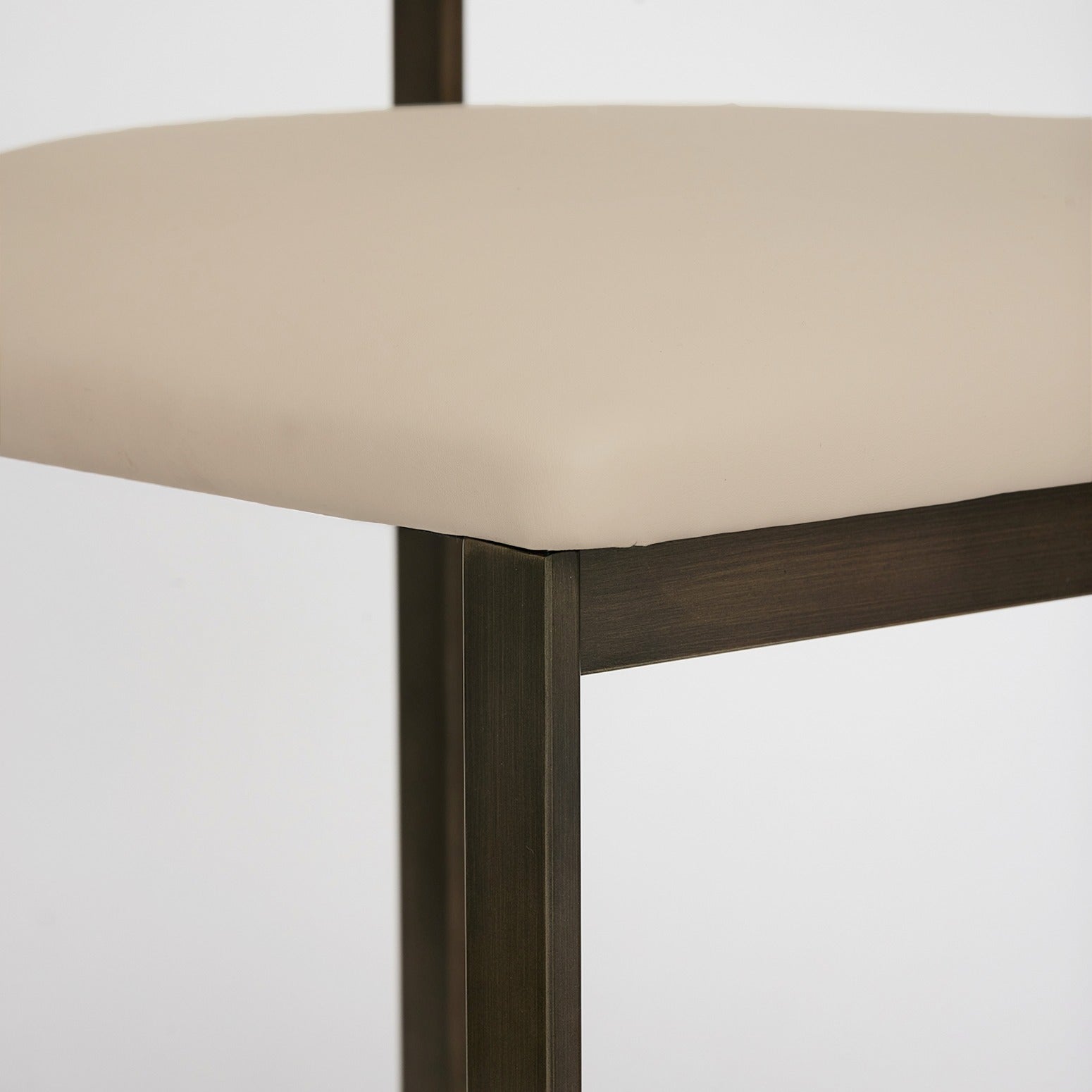 The Landon II Bar Stool commands attention with its striking geometric stainless steel base finished in antique bronze, paired with a sumptuous cream latte vegan leather seat. A refined choice for those seeking to elevate their space with contemporary style and understated elegance.