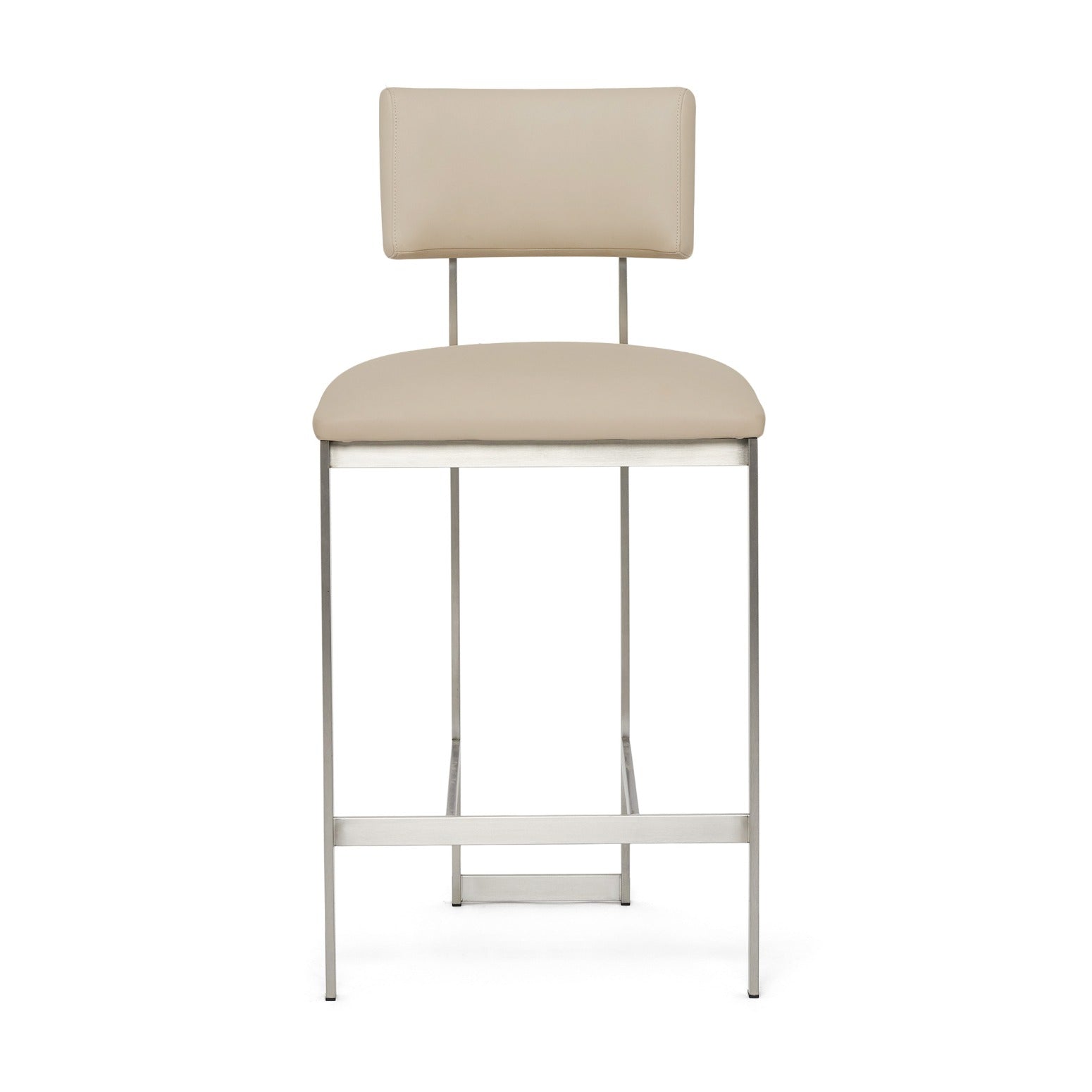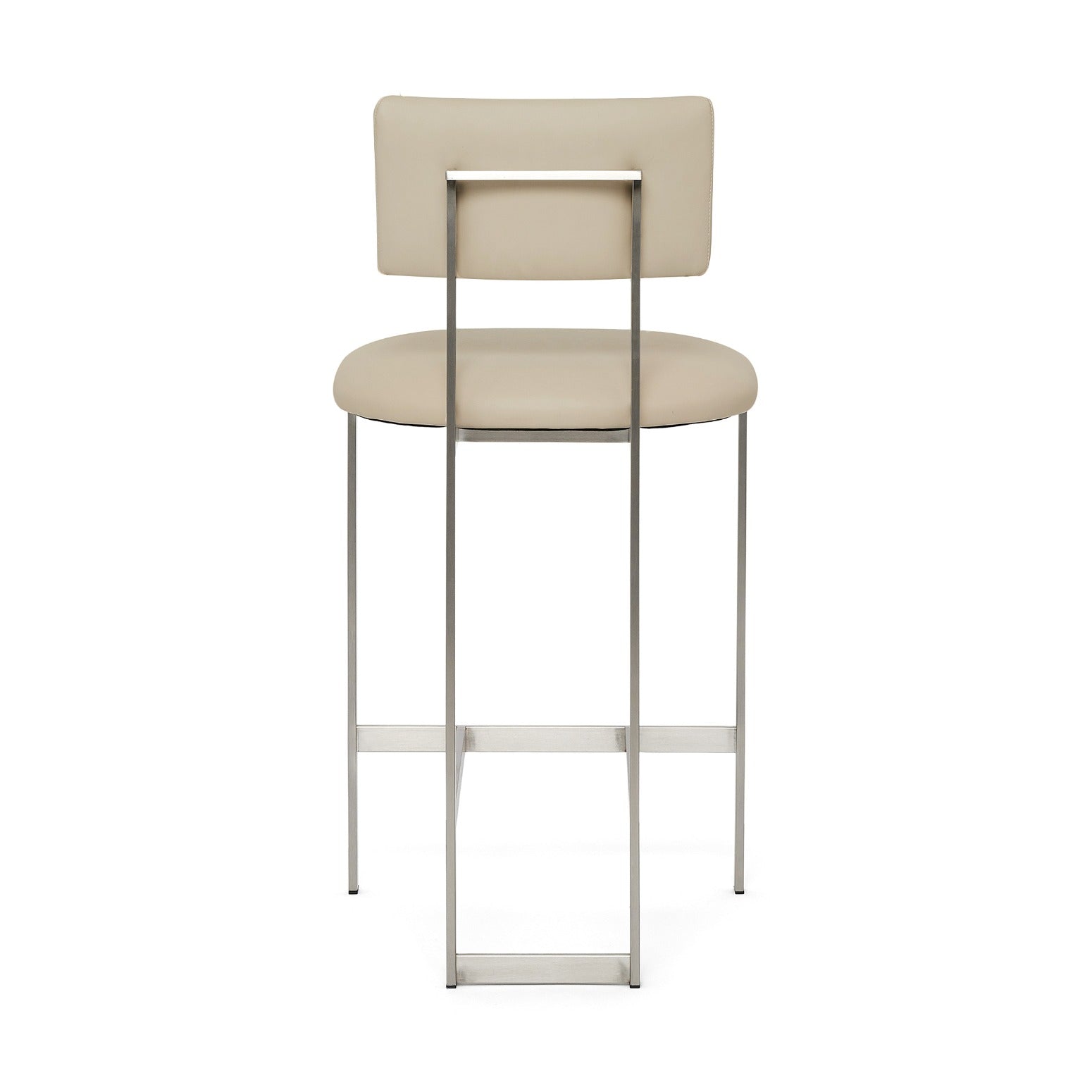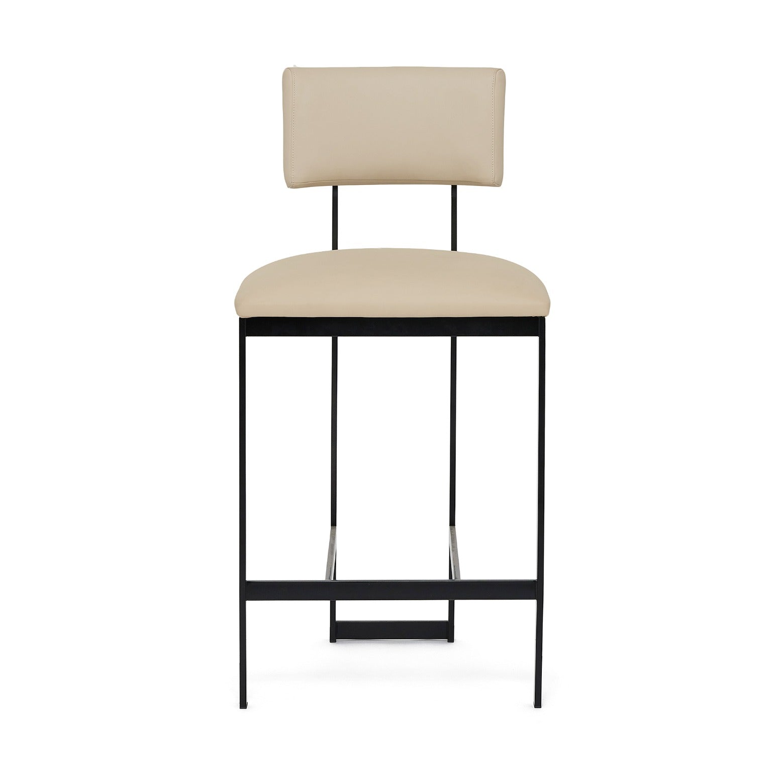 The Landon II Counter Stool commands attention with its striking geometric stainless-steel base finished in matte black, paired with a sumptuous cream latte vegan leather seat. This sophisticated piece effortlessly elevates any kitchen or bar space with contemporary style and refined elegance.