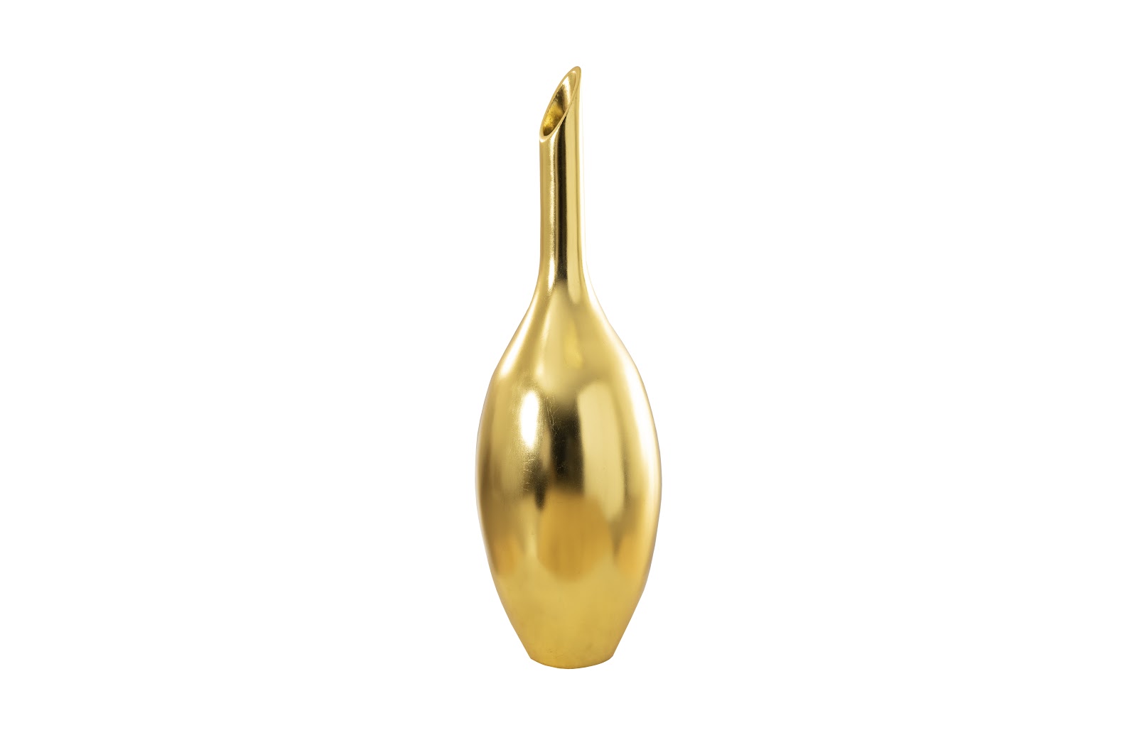 The Laura Gold Vase is a gold vessel in a long-necked bottle shape made of composite in a luminous gold leaf finish. The decorative accessory will shine even when flowers are absent thanks to its brilliant surface. We offer the Laura in three finishes, which makes them even prettier when grouped. Combining the gold Katha and Julian vases with this version of the Laura also creates a powerful arrangement. All of these reflect the ethos the Phillips Collection personifies: modern organic.