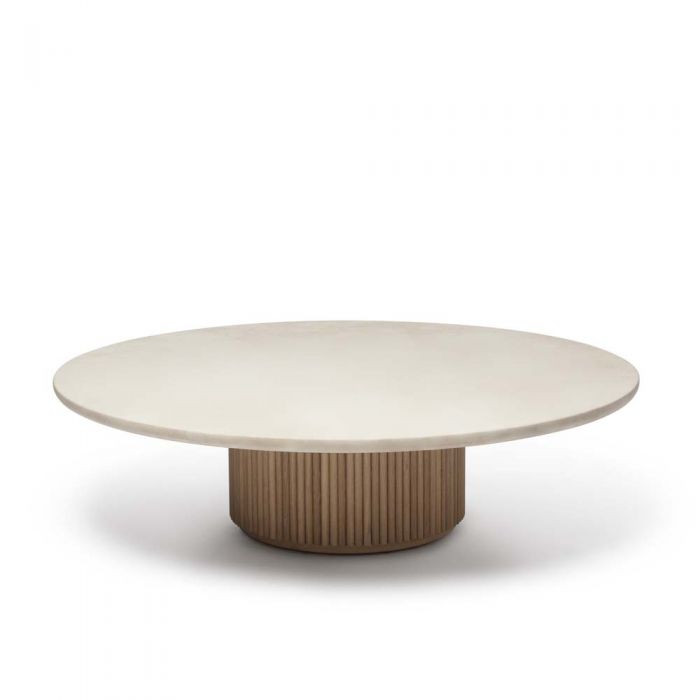 Enhanced with honey marble and featuring an exquisite, fluted oak base in saddle, the grand Laurel Round Cocktail Table exudes a blend of materials. Granite and marble are naturally occurring materials; expect variations in color, veining and texture. Delicate veins add to the tactile experience and should not be considered flaws, but rather inherent imperfections that enhance the character and allure of each individual piece.