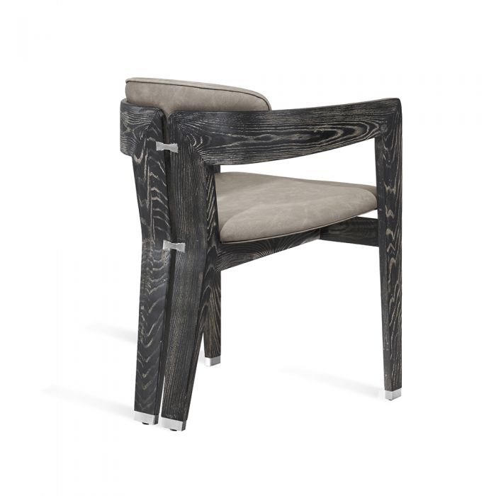 The luxurious Maryl Dining Chair boasts a ceruse-finished wood frame, complemented by a distressed charcoal vegan leather seat. Crafted from high-quality solid wood, this exquisite item may show subtle variations in hue due to the natural coloration of the base material.