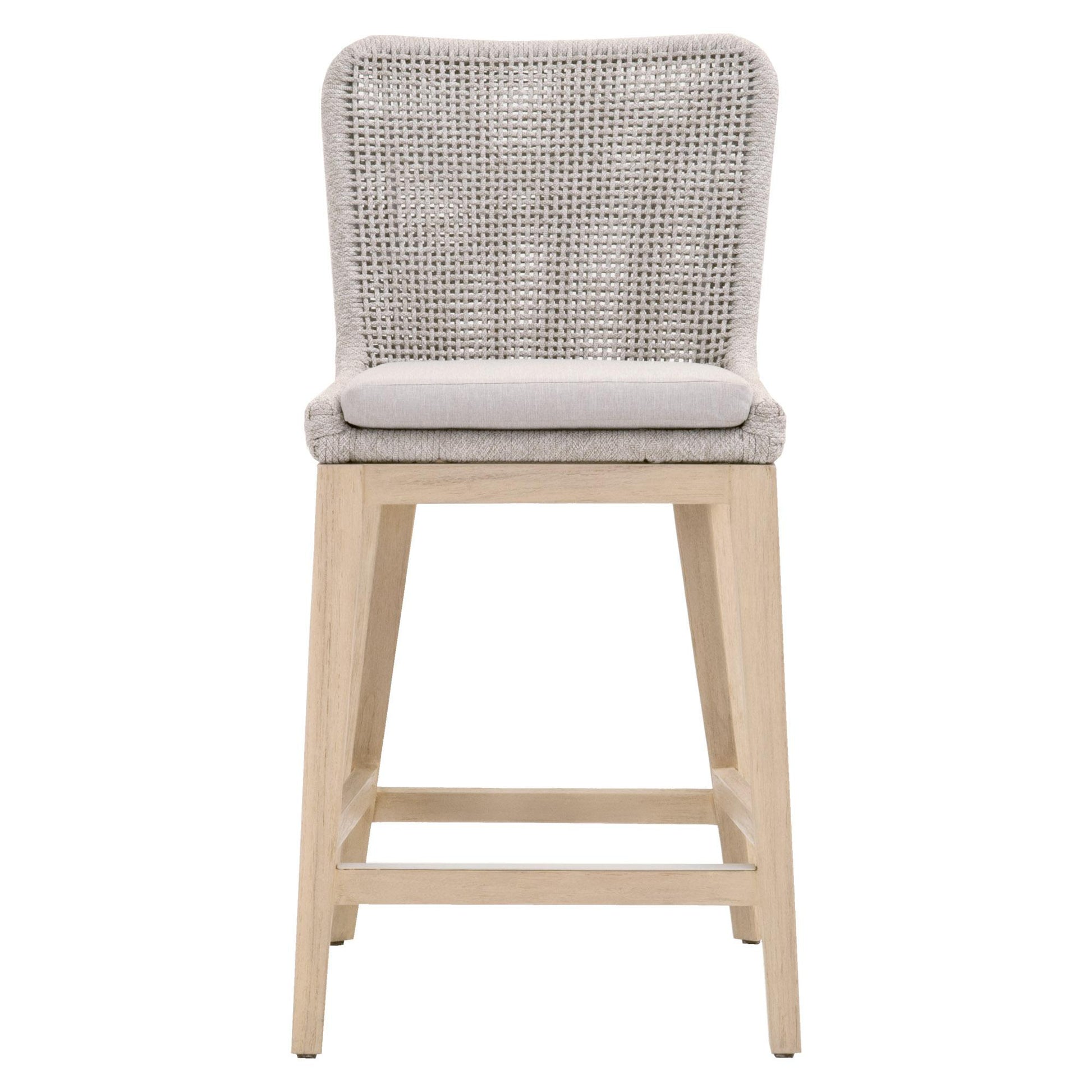 Set the tone of a casual and beachy atmosphere with this rope Mesh Outdoor Counter Stool . It measures 19.5 inches wide, 21 inches deep, 39 inches high, and has a seat height of 26.5 inches. This outdoor stool is carefully crafted with an intricately woven taupe and white polypropylene rope designed in a mesh-like pattern. The base is made of solid gray teak and the rope frame has an aluminum base for sturdy support and quality craftsmanship. The removeable seat cushion is made of a high-performance pumice olefin fabric that makes cleaning a bit easier. The stool and cushion should be stored away in extreme conditions. Furnish your patio or complete your outdoor bar set with this coastal-inspired outdoor counter stool.