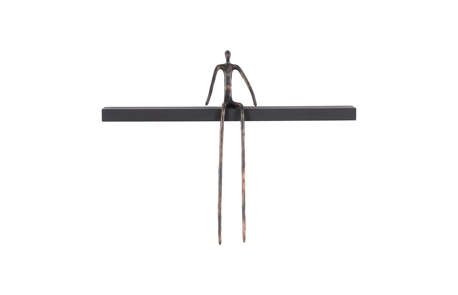 The clean lines of the slim decorative sculpture ornamenting the Long Moveable Sitting Man Shelf makes this a perfect accent piece for contemporary, modern farmhouse, and mid-century modern interiors. Abstractly rendered in metal in a bronze finish on a shelf in a black finish, the slim decorative accessory is whimsical on its own and will remain just as playful when other decorative elements are placed on the wood shelf. We also offer the long shelf with movable pointing, leaning, and standing men, which can be combined in an artful arrangement on an accent wall. These same figures also ornament shorter shelves in our decorative offerings. Each of these reflect the ethos that Phillips Collection personifies: modern organic.