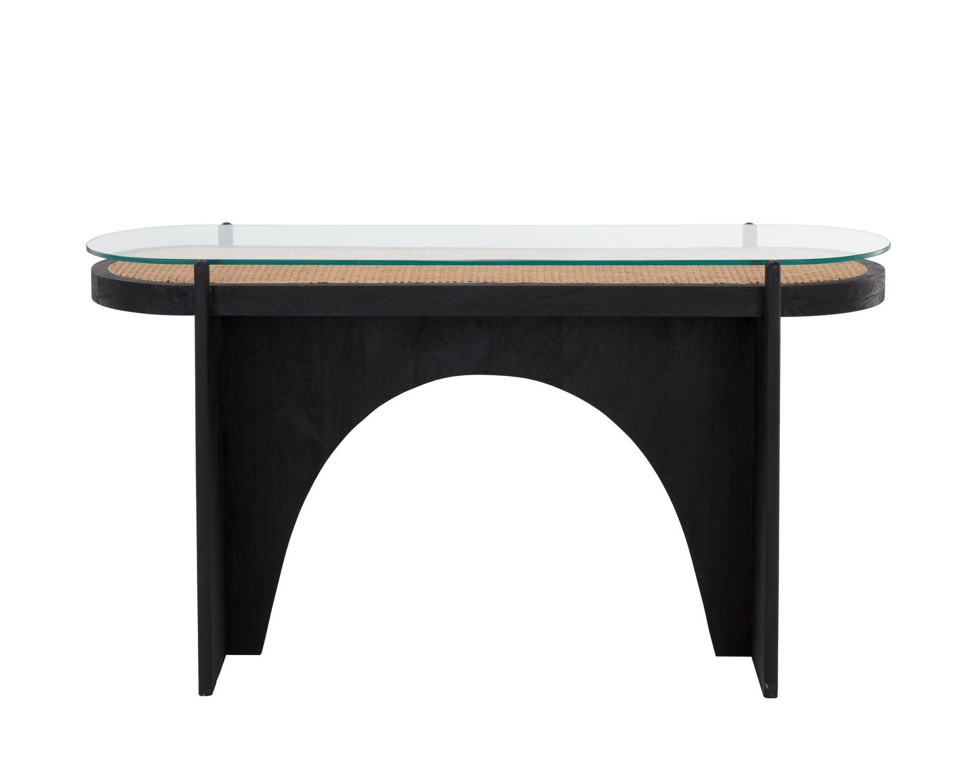 Inspired by global travels, the Adora Console Table combines old world influence with modern style. Features natural rattan top covered with clear glass and a sculpted black mango wood base. An intriguing design from all angles. Coordinating coffee table also available. Made in India. With refined craftsmanship, this design was brought to life by skilled local artisans. By nature, these materials develop unique imperfections such as fissures, markings and colour variations for a truly one-of-a-kind piece. Handle With Care: This design has been crafted with rattan. This artisan-crafted material features intricate weaving that results in natural variations where no two pieces are alike. Colour and texture differences are to be expected and embraced with this natural material. Due to the weaving process used, the fibres in this material may display shorter or longer lengths where the weaving ends. Visit our Product Care page for more information on how to ensure the lasting beauty of this piece.