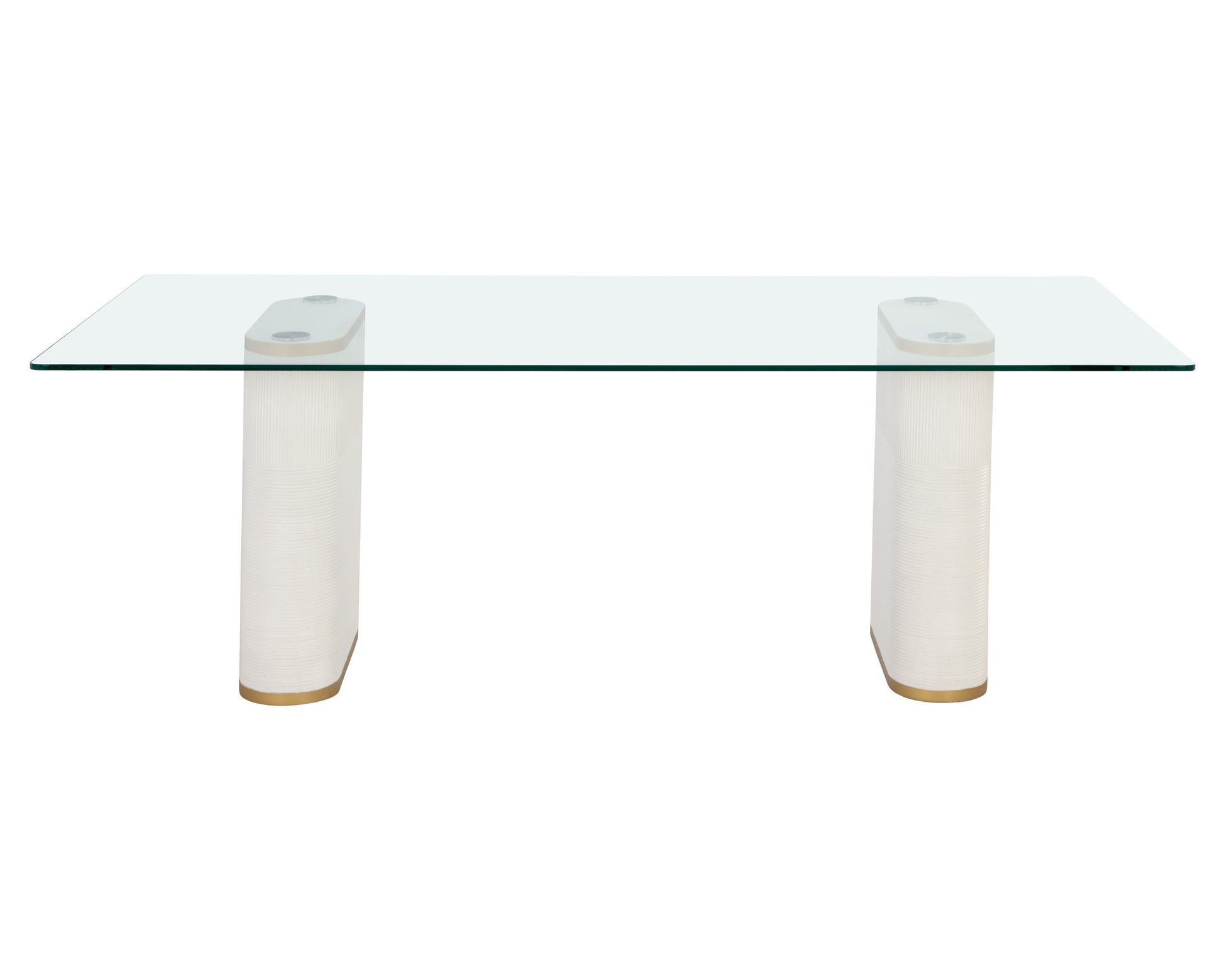 The Aemond Dining Table will add a touch of elegance to any dining space. Features a rectangular clear glass tabletop that sits on two white concrete legs. Features lined detailing and gold accents on the base for added dimension to the look.