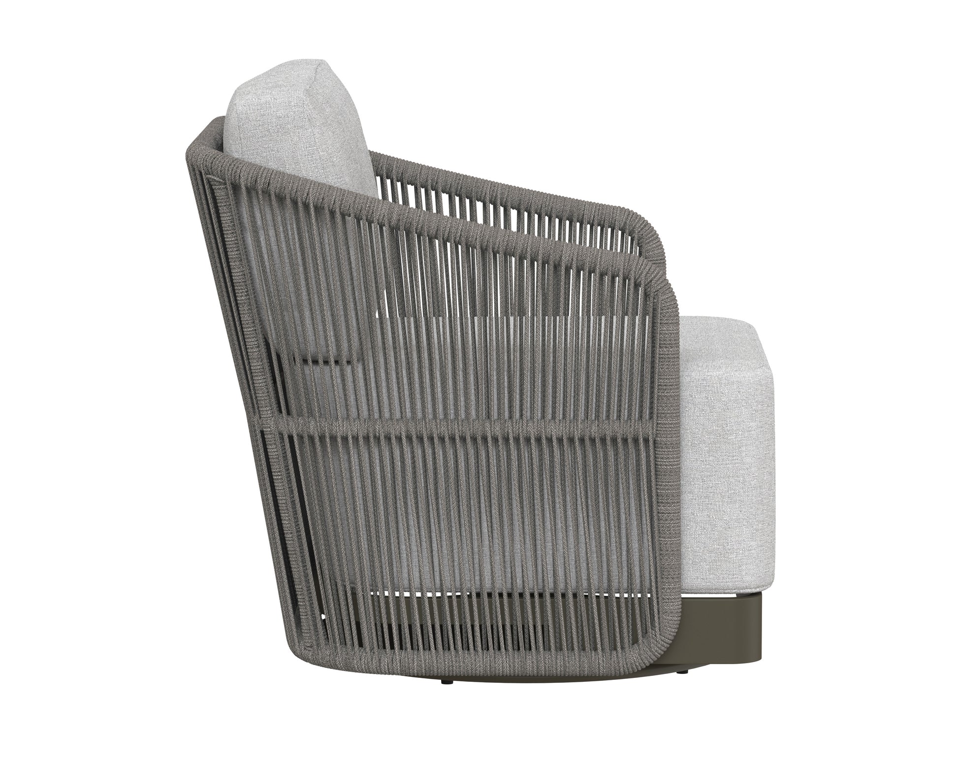 Introduce refined modern style outside with this impressive swivel armchair from the Outdoor by SUNPAN collection. Upholstered in gracebay light grey fabric with a powder-coated warm grey aluminum frame. Completed with grey rope weaving on the seat exterior.