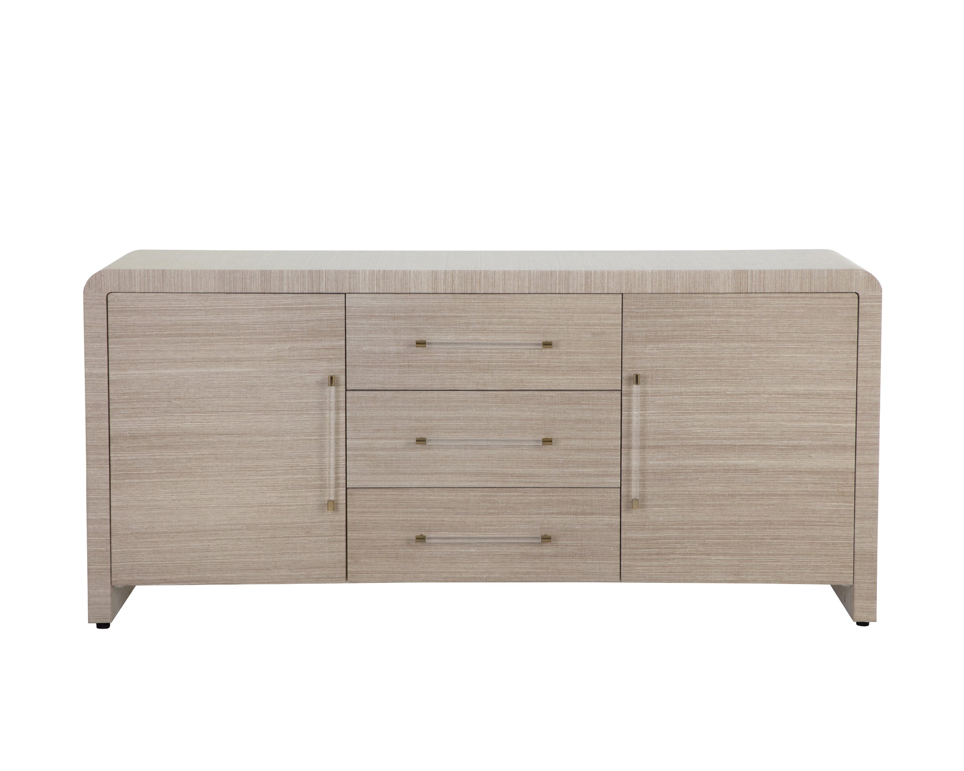 Fusing modern style with a design inspired by global travels, this richly textured sideboard will add definition to any space. Crafted from a wooden frame with a sand raffia covering. Features three soft-closing drawers and two cabinets. Completed with steel and clear acrylic handles. Anti-tip kit included. Handle With Care: This design has been crafted with raffia. Each item will exhibit unique traits such as texture and thickness variations that add to the natural character of this finely woven material. Visit our Product Care page for more information on how to ensure the lasting beauty of this piece. As wood is an organic, porous material, these pieces will contain natural variation of texture and may also exhibit fine indentations and cracks. Wood pieces will also display a disparity of colour and grain, and visible knots and burls that add to the character of each piece.