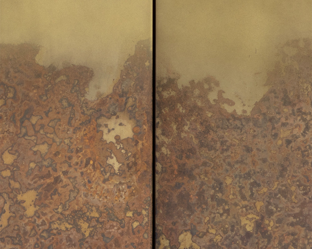 Inspired by global travels, this unique media console and cabinet exudes an exotic vibrance. Features four cabinets with antique brass ombre patina fronts. Completed with a black metal frame. Pairs well with the Auburn sideboard. Made in India. With refined craftsmanship, this design was brought to life by skilled local artisans. By nature, these materials develop unique imperfections such as markings and colour variations for a truly one-of-a-kind piece.