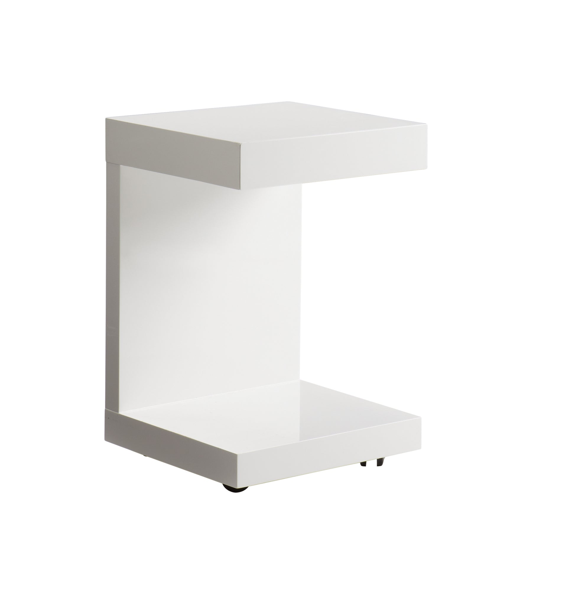 This simple but very functional c-shaped table with drawer can be used with a sofa, chair or even as a nightstand. Stocked in high gloss white. Also available in espresso and driftwood. Castors are included.