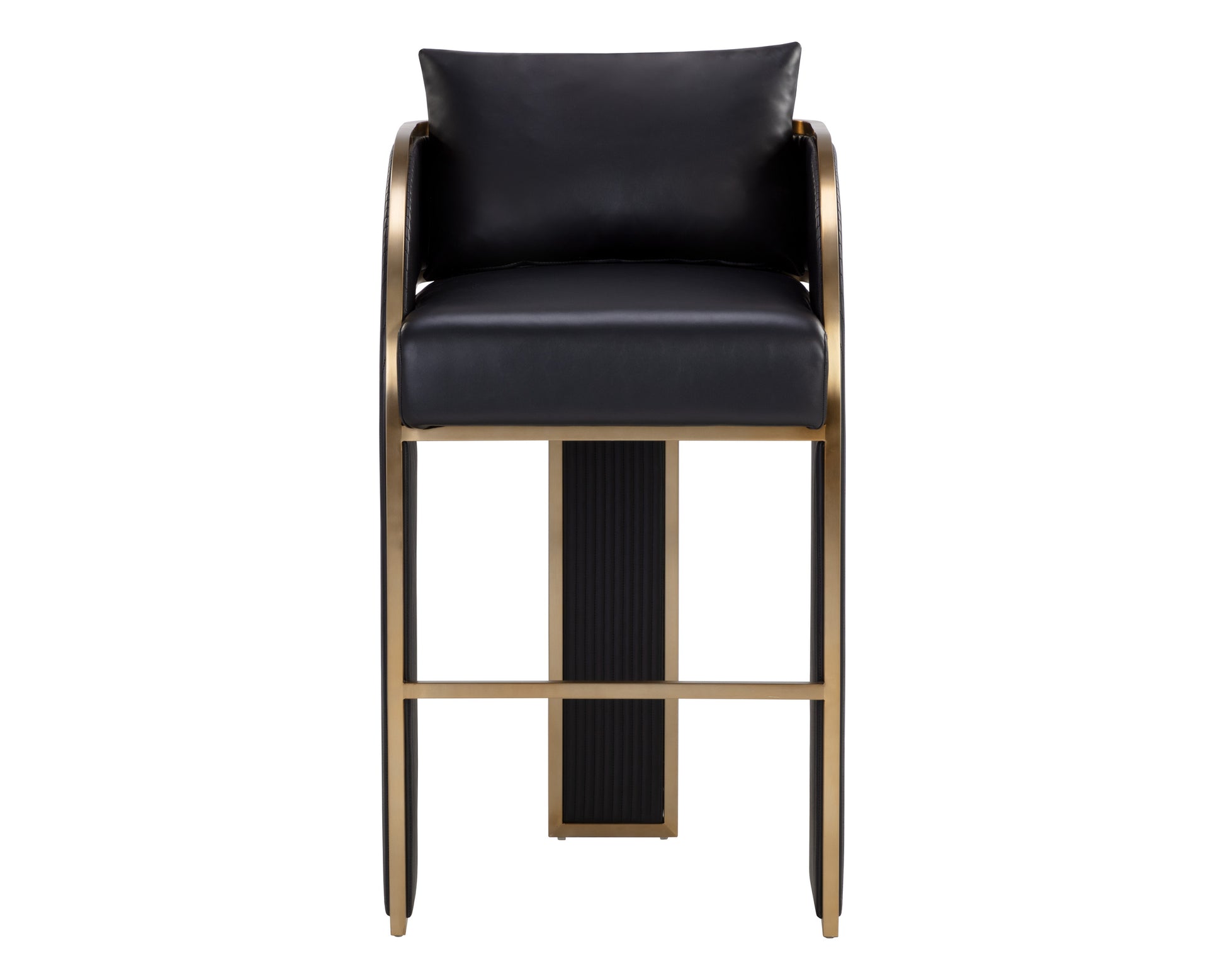 Bold and stylish, the Baz Barstool is sure to turn heads. Featuring a daring silhouette upholstered in napa black faux leather. Gold stainless steel detailing and channel stitching add depth and visual impact to the overall look of the piece. Handle With Care: This design has been crafted with faux leather. Faux leather is manufactured to reflect the natural characteristics of leather; as such, colour variations, markings, wrinkles, grooves, and light scratches are appreciated characteristics. No two pieces will be alike. Visit our Product Care page for more information on how to ensure the lasting beauty of this piece.