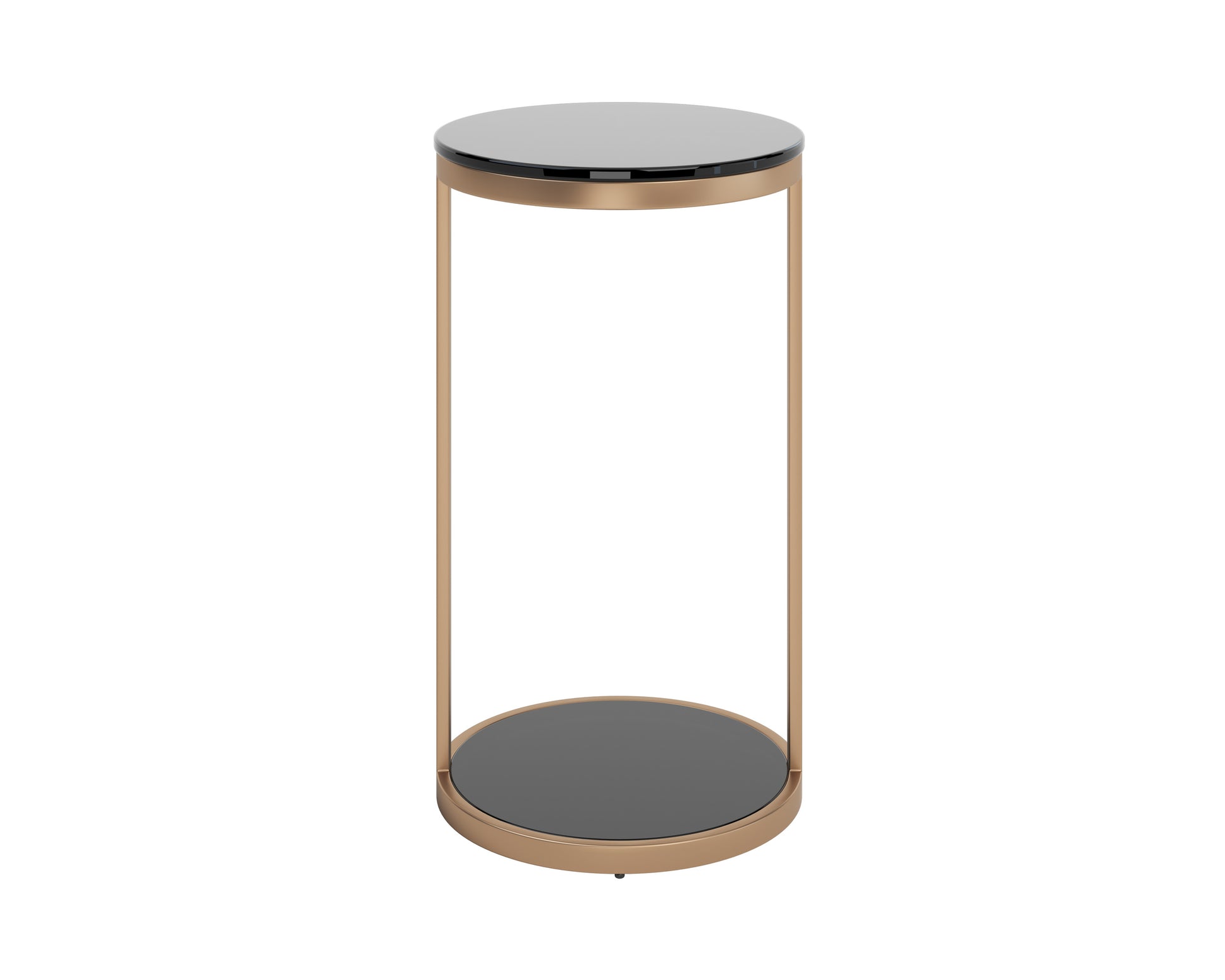 This end table features tempered black glass on an antique brass steel base. Perfect for compact spaces in both transitional and modern environments. Also available in a chrome finish.