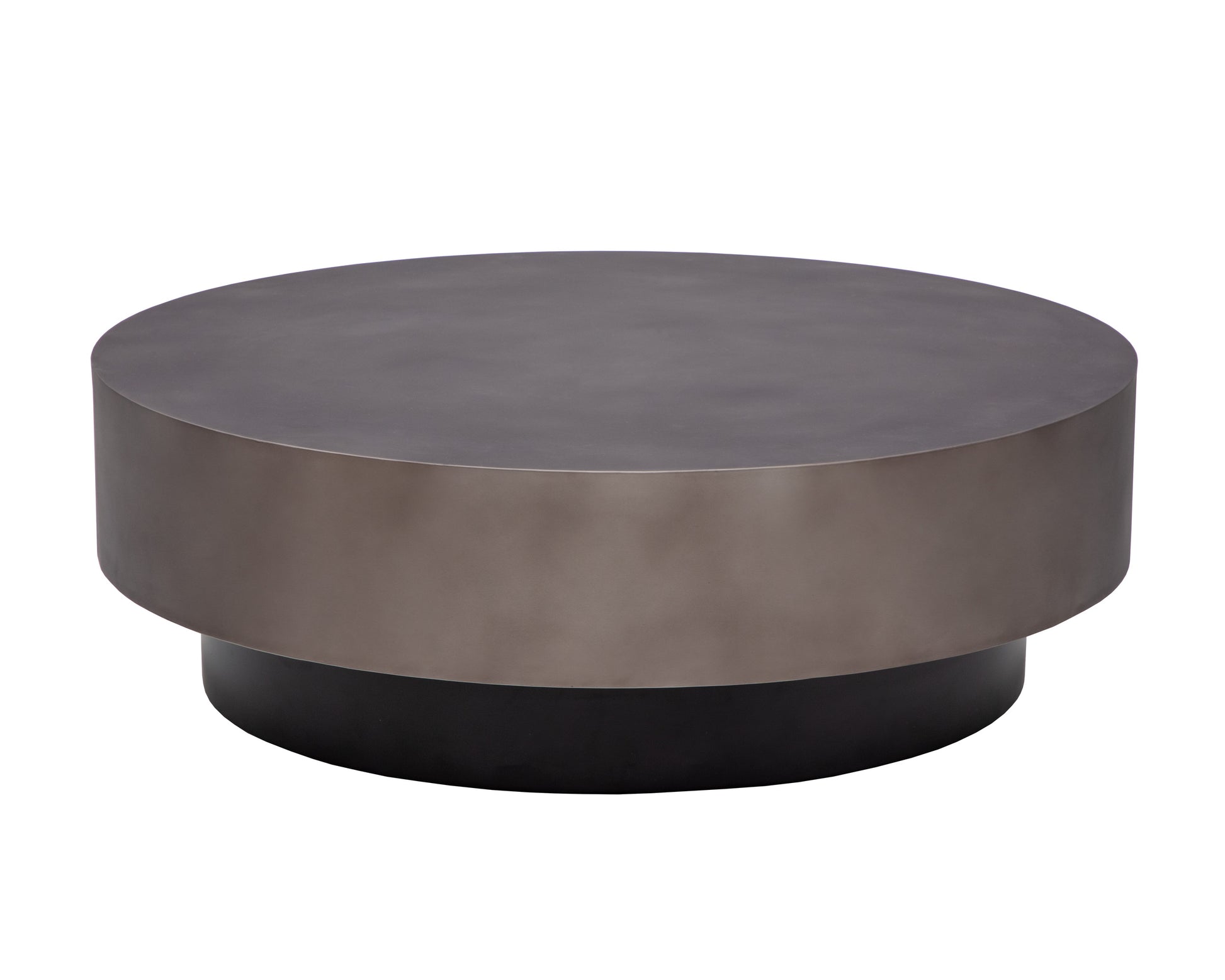 A stunning round coffee table crafted in India exudes contemporary elegance. Features a metal top with a hand-painted gunmetal finish supported by a black base. Suitable for residential and commercial living and lounge environments. Coordinating end table also available. Made in India. With refined craftsmanship, this design was brought to life by skilled local artisans. By nature, these materials develop unique imperfections such as fissures, markings and colour variations for a truly one-of-a-kind piece.