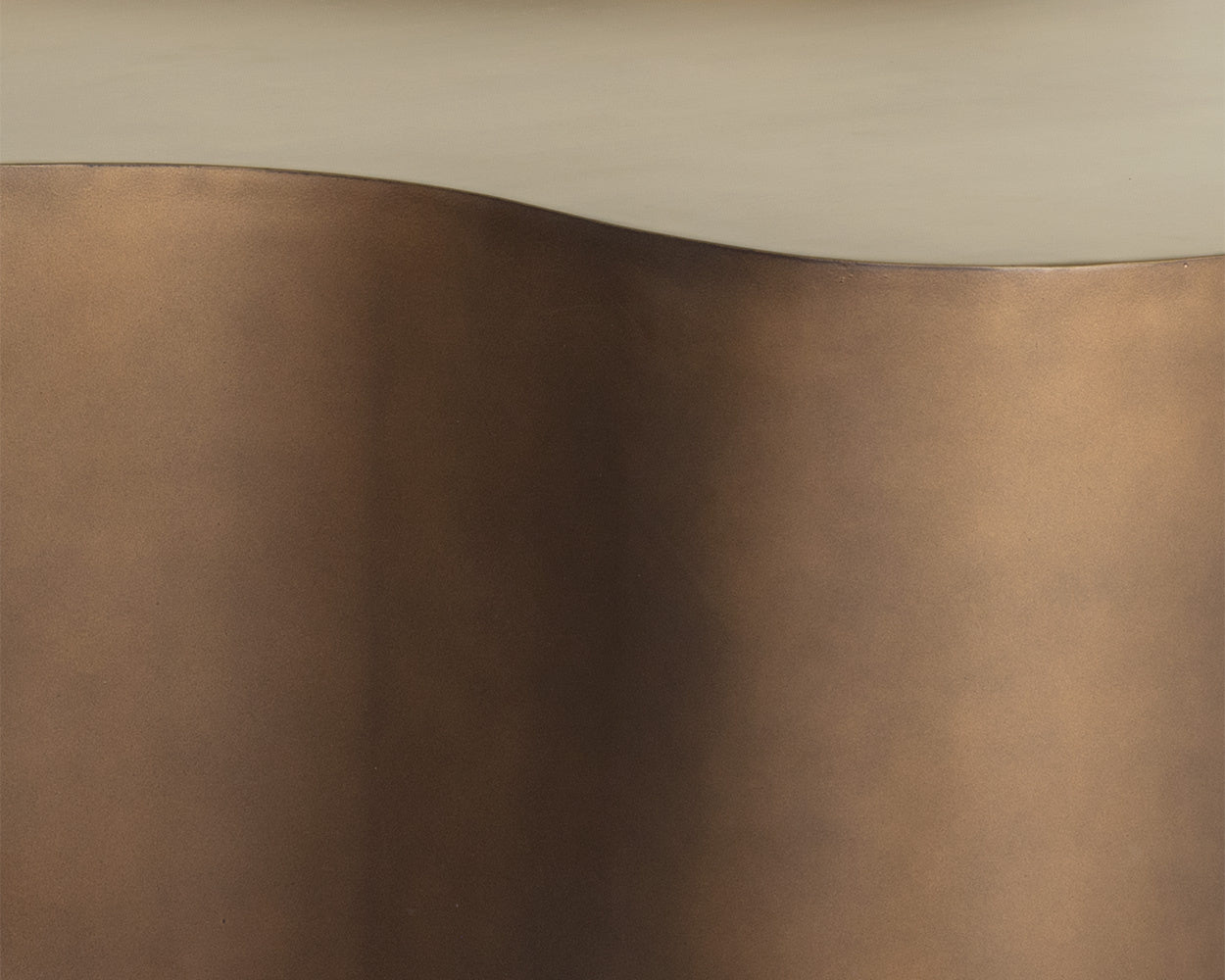 - Table base is crafted with a matte aluminum finish in antique bronze.