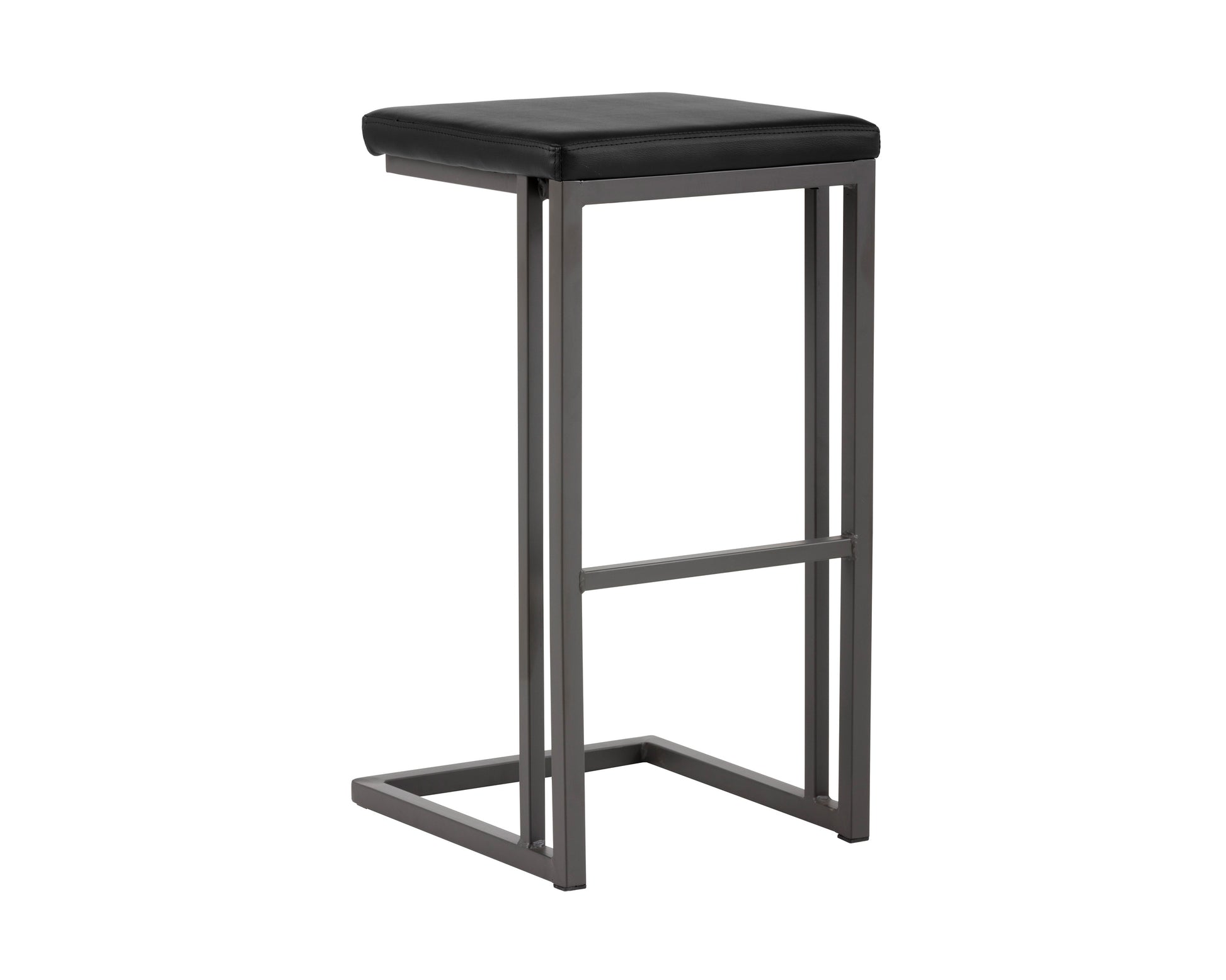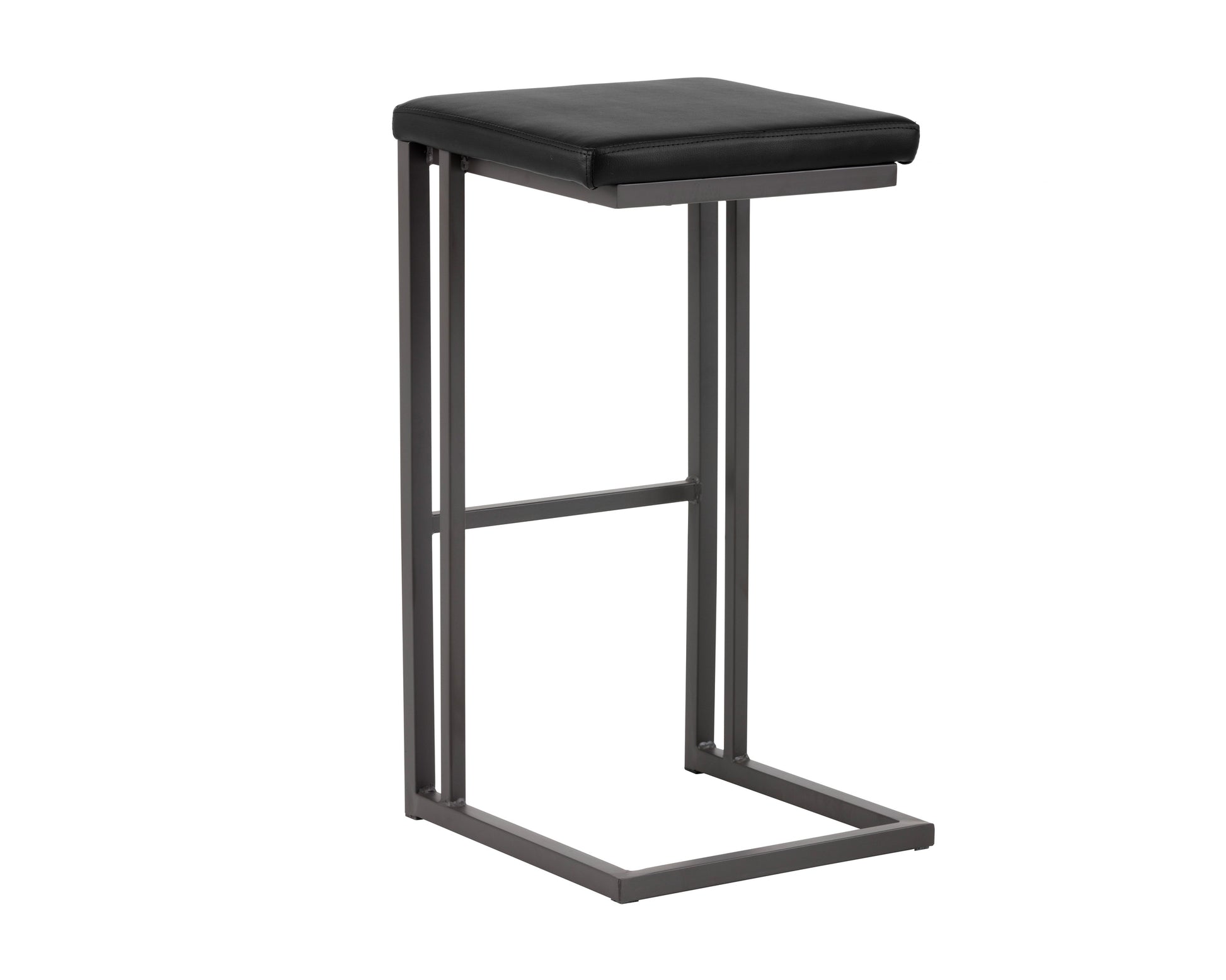 A modern industrial stool featuring a backless seat in onyx faux leather and a cantilever frame with footrest in grey powder-coated steel. Suitable for various dining, kitchen and bar spaces of all sizes. Handle With Care: This design has been crafted with faux leather. Faux leather is manufactured to reflect the natural characteristics of leather; as such, colour variations, markings wrinkles, grooves, and light scratches are appreciated characteristics. No two pieces will be alike. Visit our Product Care page for more information on how to ensure the lasting beauty of this piece.