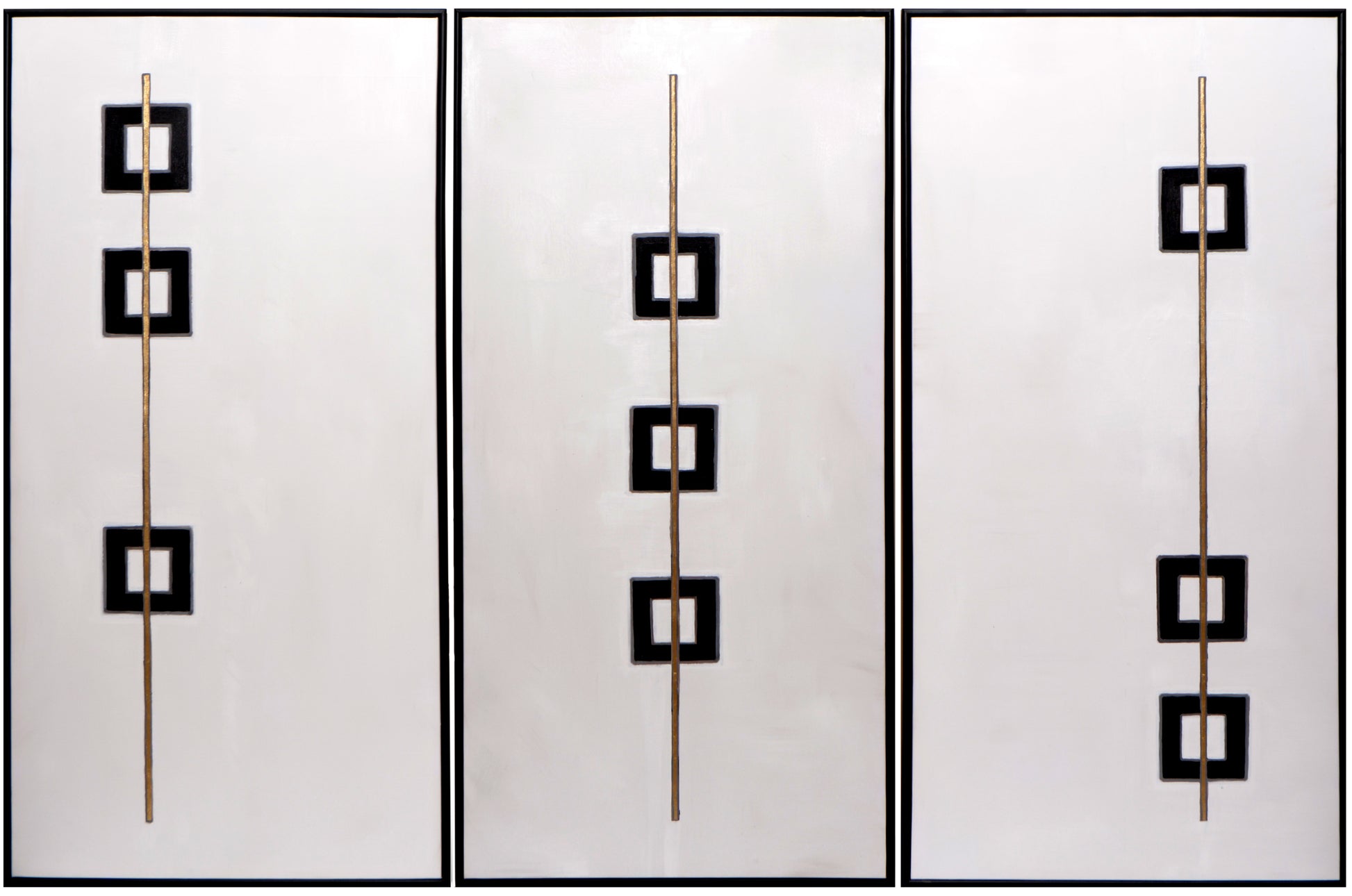 This triptych creates a calming, coordinated look with black squares and an added touch of gold. Perfect for contemporary spaces. Features a black finished wood floater frame. Each artwork is hand-painted and will feature slight variations that make every piece unique. Each artwork is hand-painted and will feature slight variations that make every piece unique.