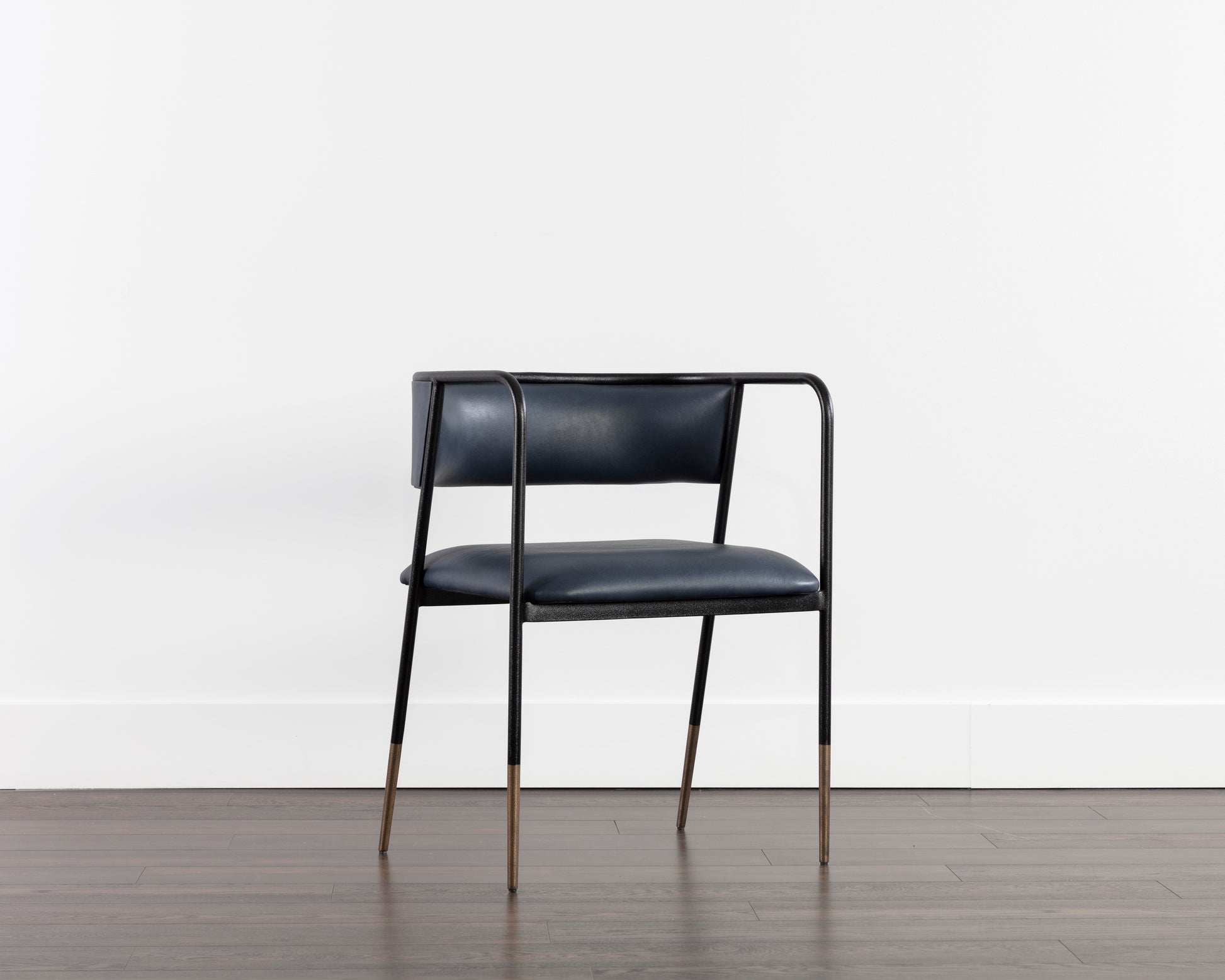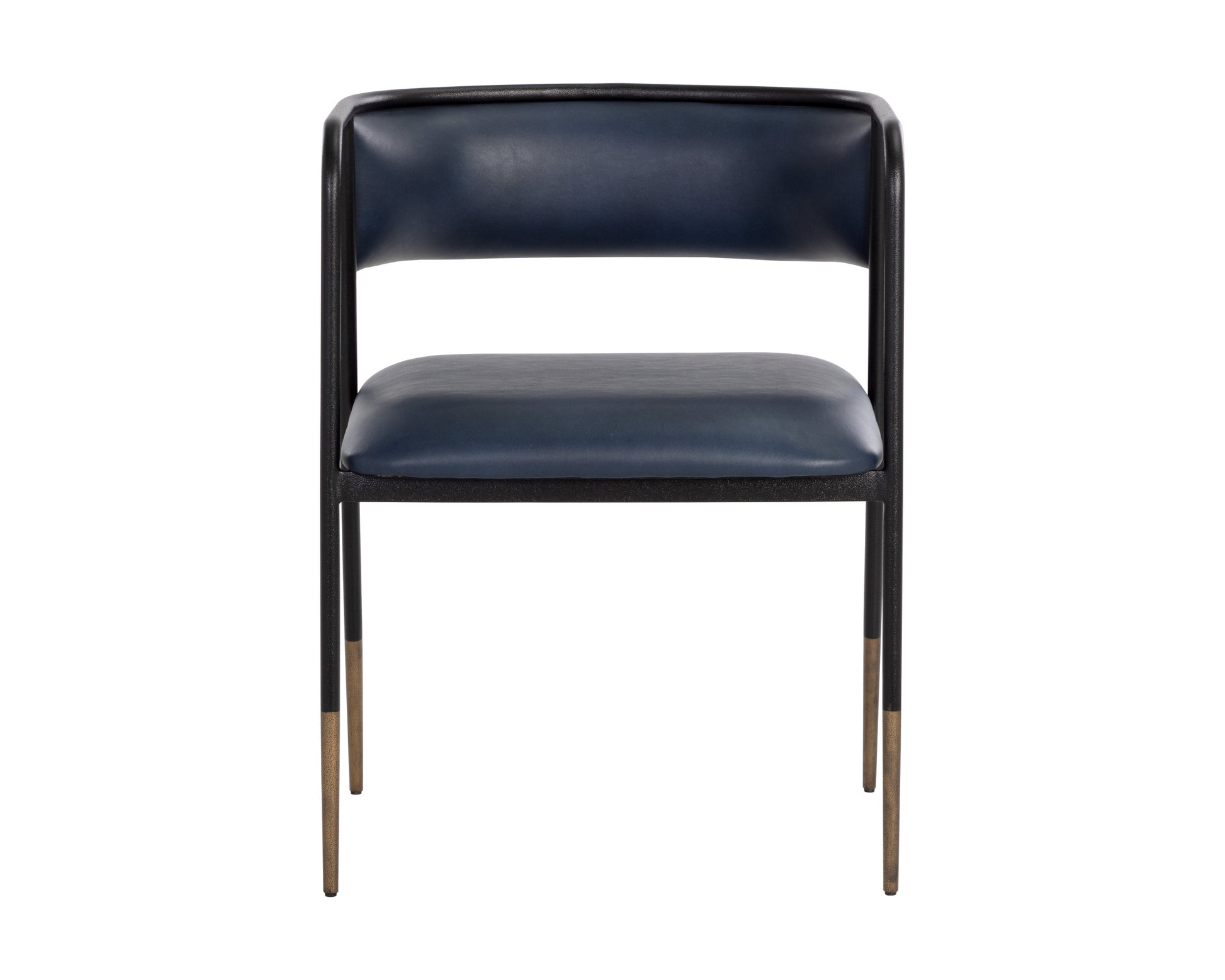 Simplicity is key with this effortlessly elegant dining armchair that features a curved backrest. Stocked in bravo admiral faux leather and completed with black metal frame and legs with antique brass tips. Handle With Care: This design has been crafted with faux leather. Faux leather is manufactured to reflect the natural characteristics of leather; as such, colour variations, markings, wrinkles, grooves, and light scratches are appreciated characteristics. No two pieces will be alike. Visit our Product Care page for more information on how to ensure the lasting beauty of this piece. Made in India. With refined craftsmanship, this design was brought to life by skilled local artisans. Due to the nature of handcraftsmanship, unique imperfections such as fissures, markings and variations in colour and shape are welcomed and appreciated characteristics for a truly one-of-a-kind piece.