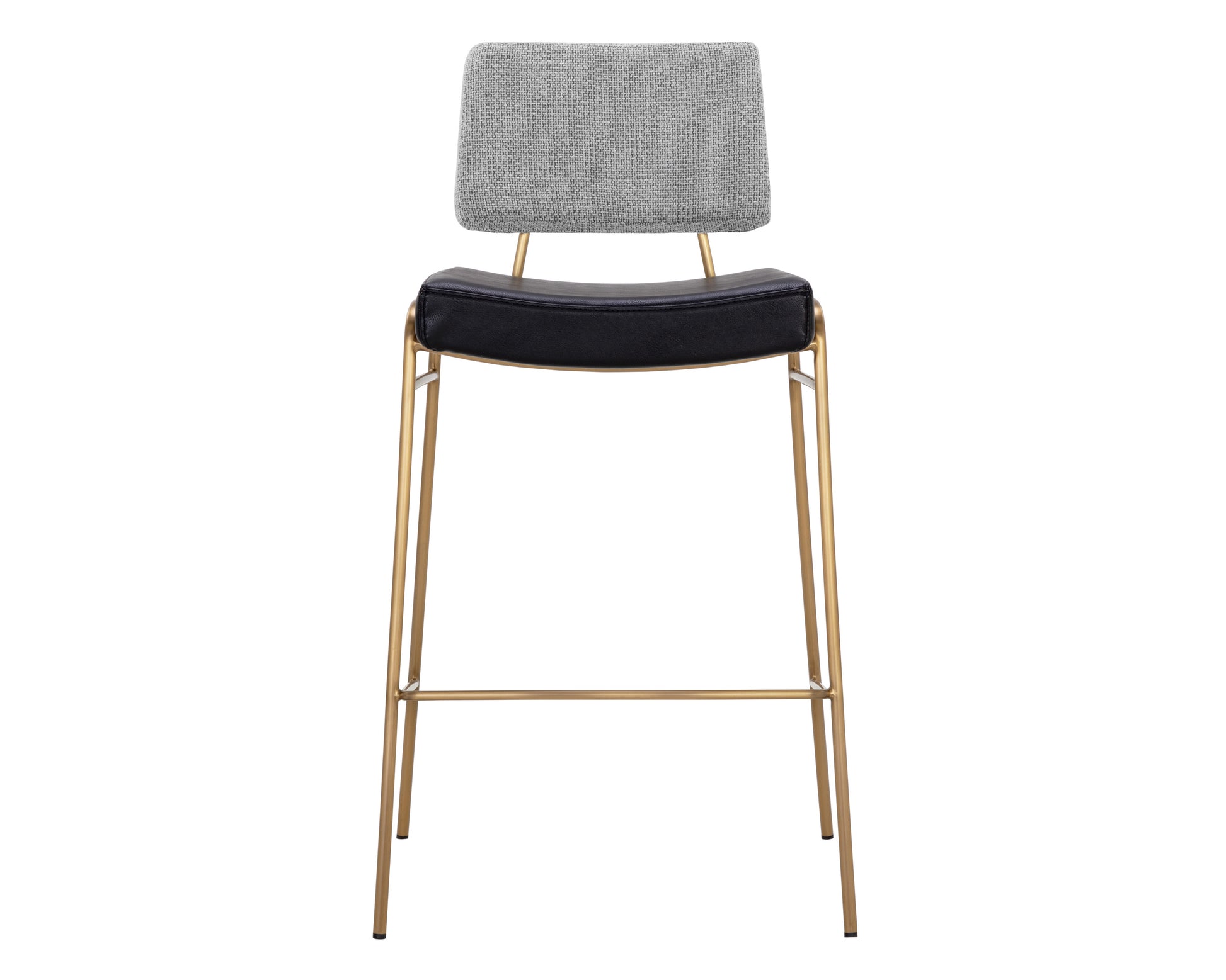 Contrasting materials bring this modern barstool to life. The seatback is stocked in chacha grey fabric, while the seat is upholstered with nightfall black faux leather. Finished with gold stainless steel legs. Handle With Care: This design has been crafted with faux leather. Faux leather is manufactured to reflect the natural characteristics of leather; as such, colour variations, markings wrinkles, grooves, and light scratches are appreciated characteristics. No two pieces will be alike. Visit our Product Care page for more information on how to ensure the lasting beauty of this piece.