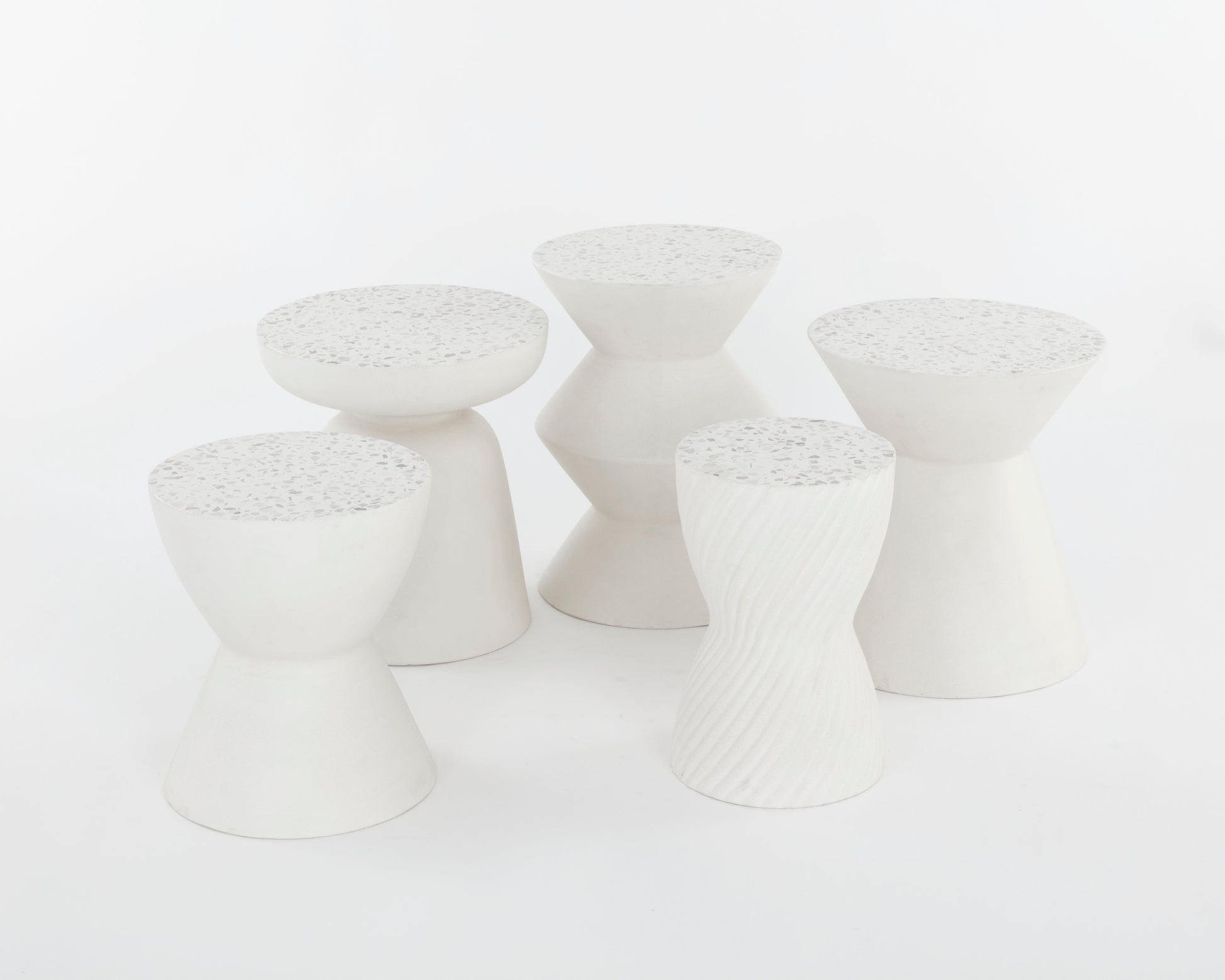 With a mesmerizing shape, this modern and contemporary end table is well defined by its stunning swirl indentation on the base. Made with a white concrete base and terrazzo top consisting of durable material chips such as marble, granite or quartz mixed into a binder like cement or epoxy resin and white concrete base. Crafted from a natural concrete mix, each piece will look different. Variations in colour, texture, imperfections, surface scratches and non-structural hairline cracks are considered inherent and valued qualities of the material.