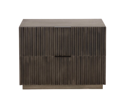 This bold nightstand will command attention in any bedroom space. Features a taupe mango wood frame with dramatic sculpted details on the face of the two drawers. Antique bronze powder-coated aluminum handles complete the modern look. As wood is an organic, porous material, these pieces will contain natural variation of texture and may also exhibit fine indentations and cracks. Wood pieces will also display a disparity of colour and grain, and visible knots and burls that add to the character of each piece. Made in India. With refined craftsmanship, this design was brought to life by skilled local artisans. By nature, these materials develop unique imperfections such as fissures, markings and colour variations for a truly one-of-a-kind piece.