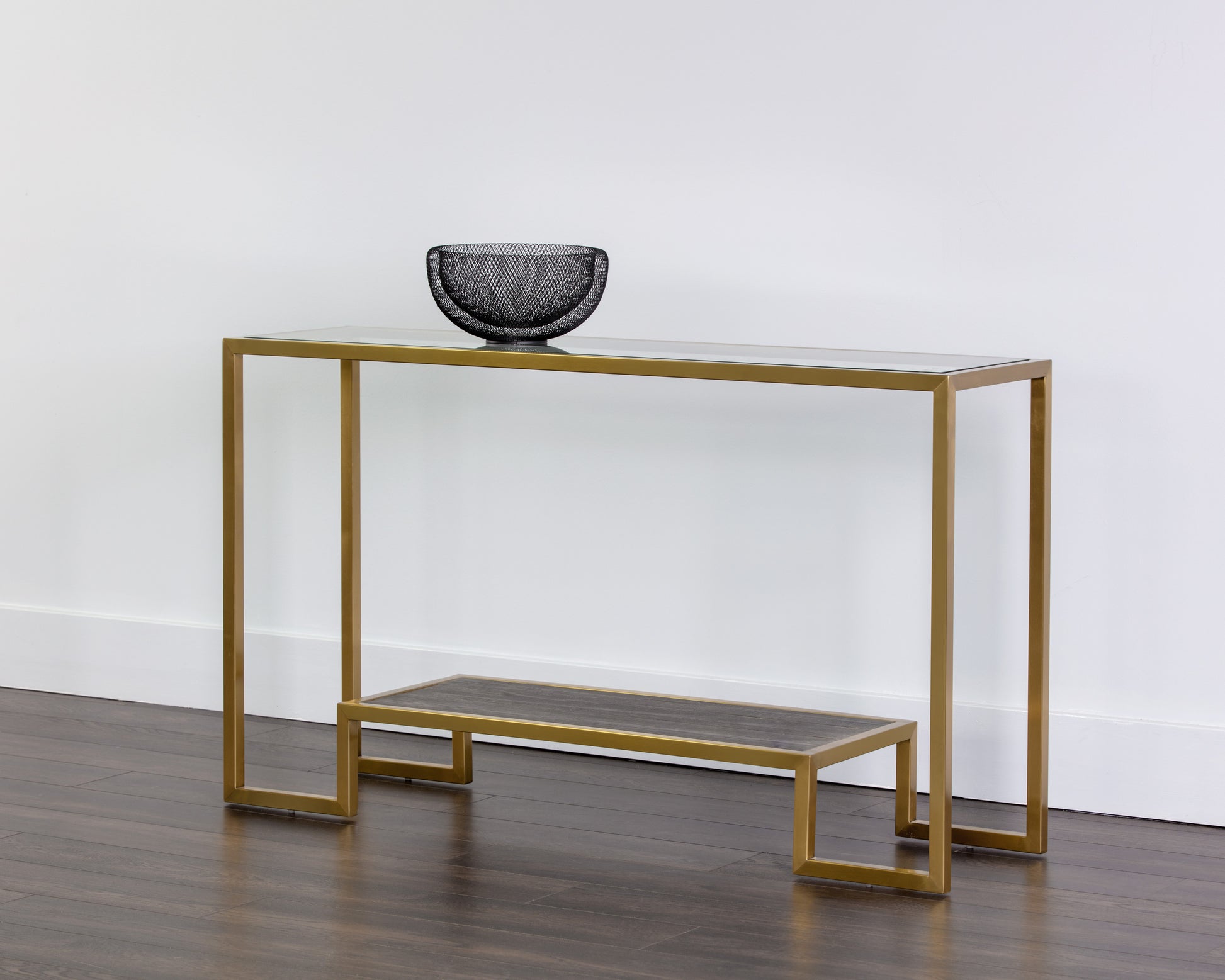 This console table combines contemporary with rustic elements reminiscent of mid-century modern styling. Features a tempered glass top, a bottom shelf composed of planks of solid Elm in a smoked brown finish, and a rich matte gold stainless steel frame.