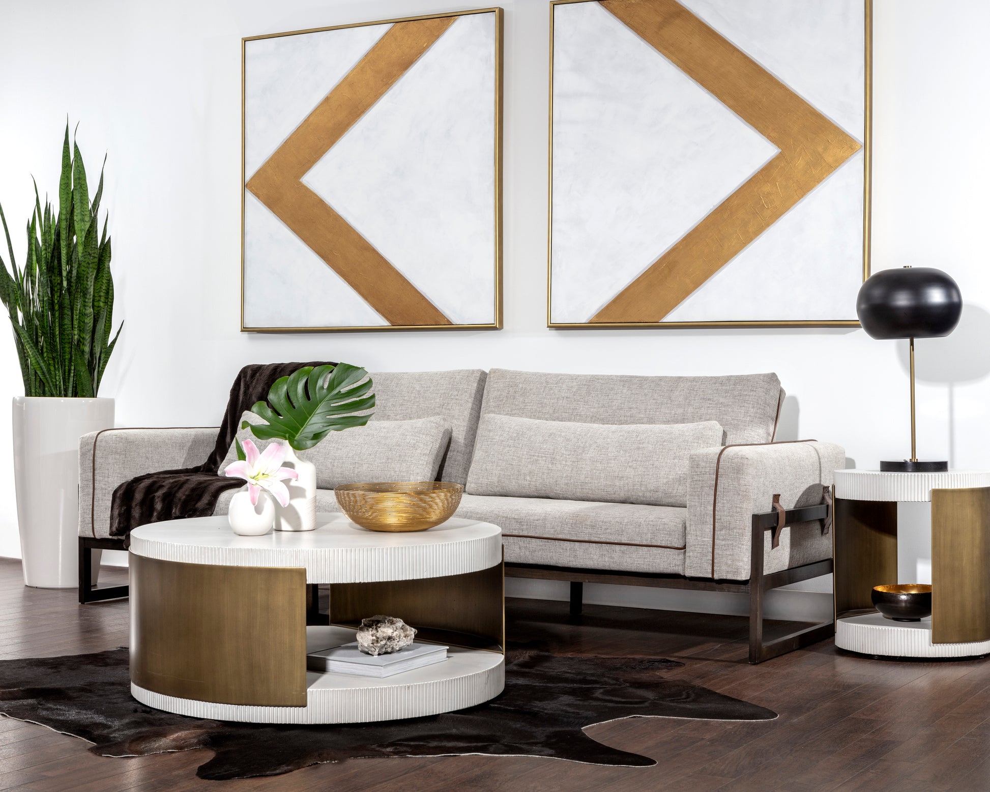 The Cavette coffee table combines old world influence with feminine flair. Features a ridged white concrete top and base with a brass steel frame.