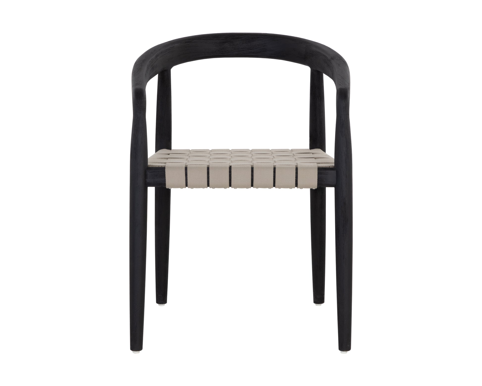 Contrasting textures with impressive details elevate this stylish dining armchair from the Outdoor by SUNPAN collection. The seat is made with Italian all-weather strap which is constructed from 100% recyclable polypropylene fiber for long lasting durability and comfort. Completed with a solid, charcoal-coloured teak wood frame. Suitable for indoor and covered outdoor spaces.