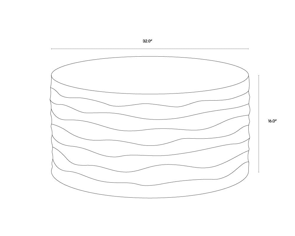 This large, round coffee table will create a moody environment. This piece features hand sculpted ridges with a painted brass finish. The perfect addition to living, lounge and office spaces.
