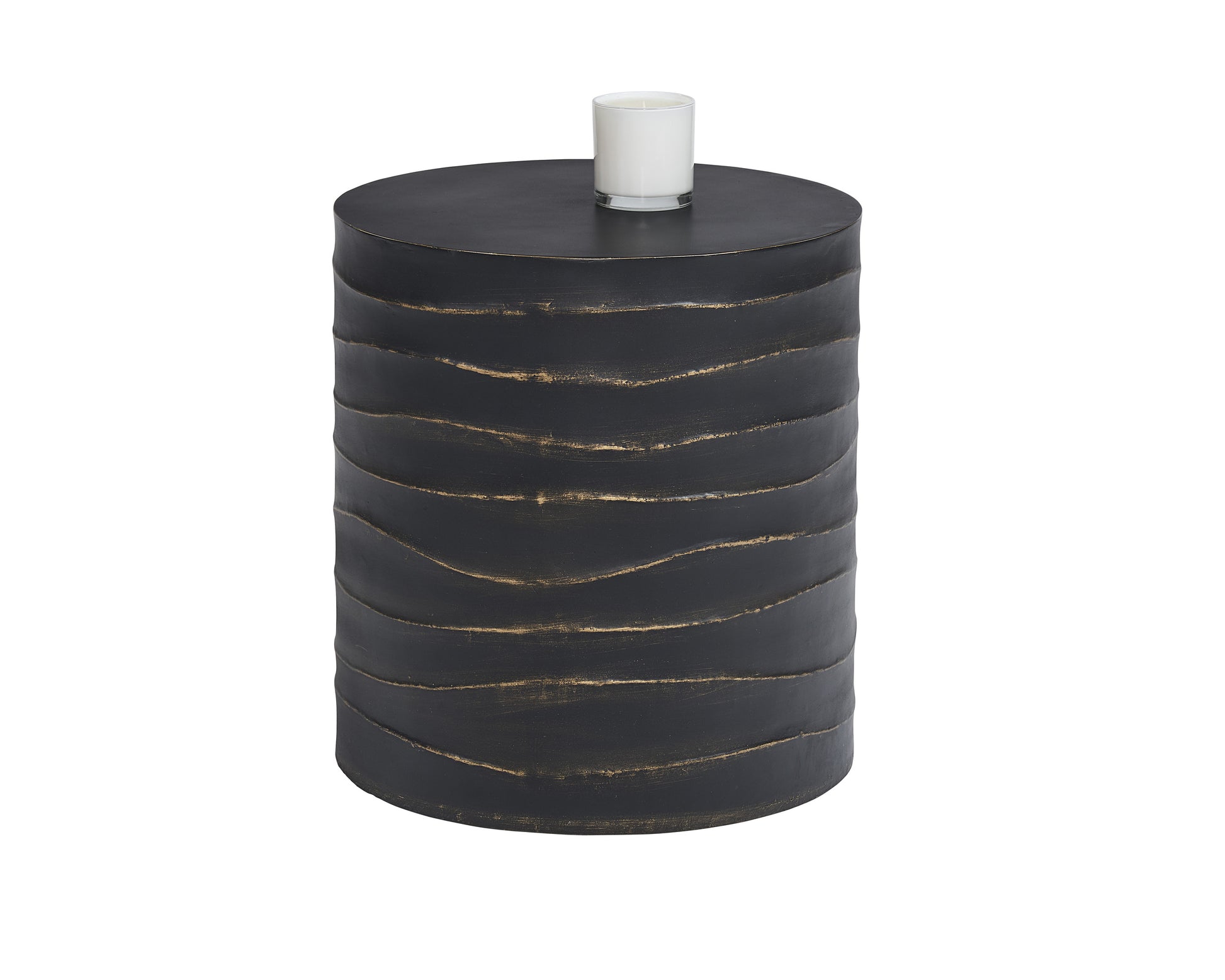 This round side table will create a moody environment. Crafted from concrete, this piece features hand sculpted ridges with a painted brass finish. The perfect addition to living, lounge and office spaces.