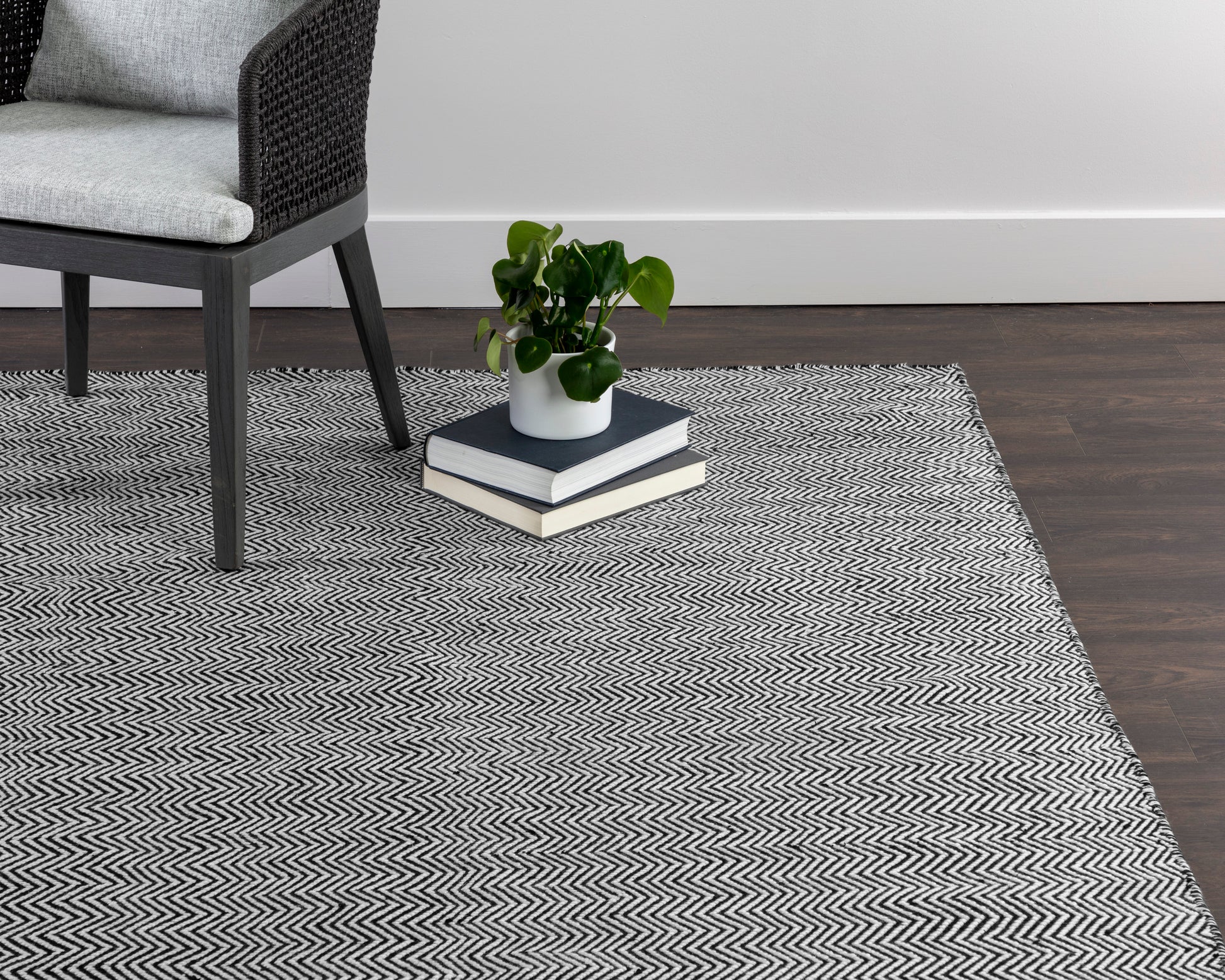 Hand-woven with a distinct zigzag pattern, this modern and stylish rug is a great addition to any space. This versatile rug made by skilled local artisans can be used for both indoor and covered outdoor spaces. Available in black and white hues.