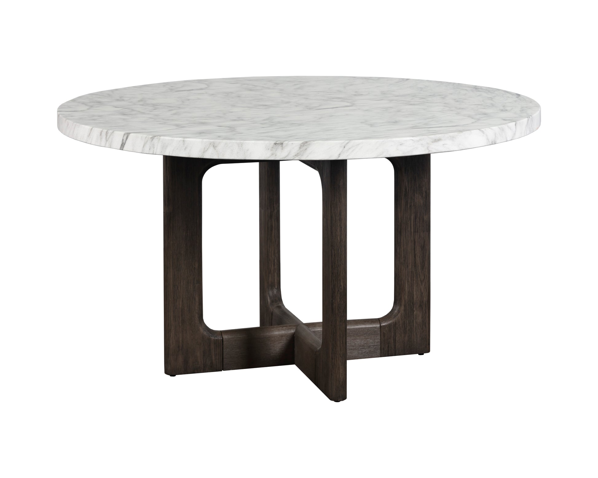 A 55" round concrete with a white marble look finish dining table top. Intended for use with Cypher dining table bases in dark brown acacia wood or white marble look.