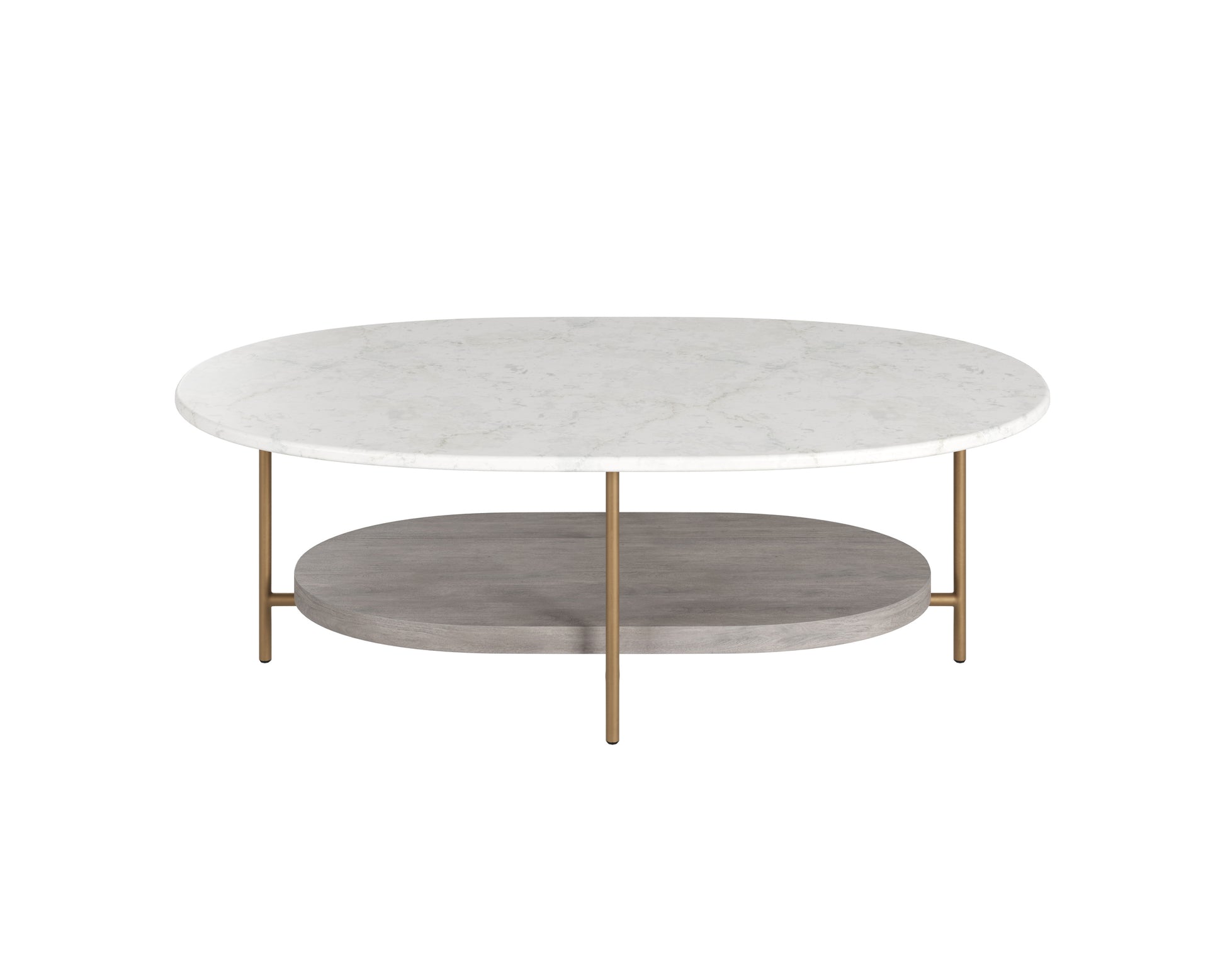 Combining a rich mix of materials, this oval coffee table is inspired by mid-century designs. Features a white Banswara marble tabletop and a grey acacia wood shelf. Completed with an antique brass iron frame. Made in India. With refined craftsmanship, this design was brought to life by skilled local artisans. By nature, these materials develop unique imperfections such as fissures, markings and colour variations for a truly one-of-a-kind piece. As marble is a natural material, unique veining, pitting, fissures, micro-cracks and colour variations are all characteristics that add to the uniqueness and beauty of each piece.