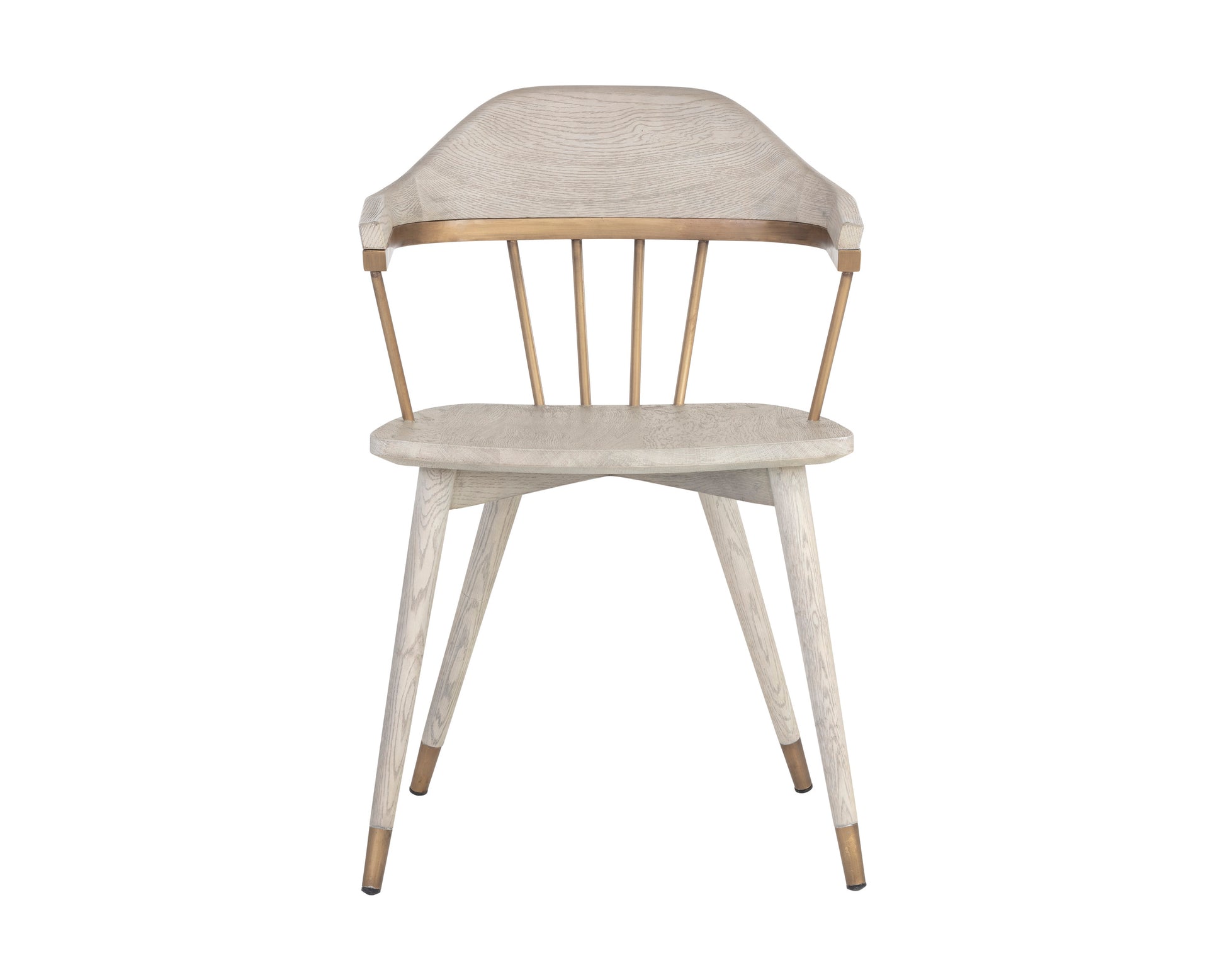 The classic elegance of this dining chair is guaranteed to make a statement in any dining room. The stylish antique brass spindles complement the matching metal caps of the chair legs. Completed with a grey solid oak wood base.