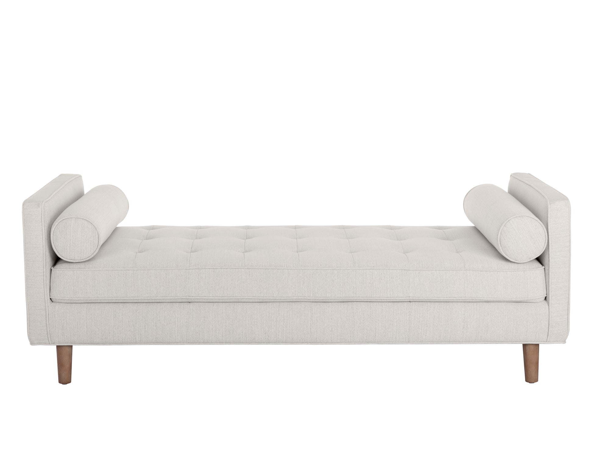 This attractive mid-century designed bench is a timeless addition to any space. Upholstered in mina ivory fabric with button tufting and piping detail. Finished with a natural birch wood base. Also available in tobacco tan faux leather with black birch wood.
