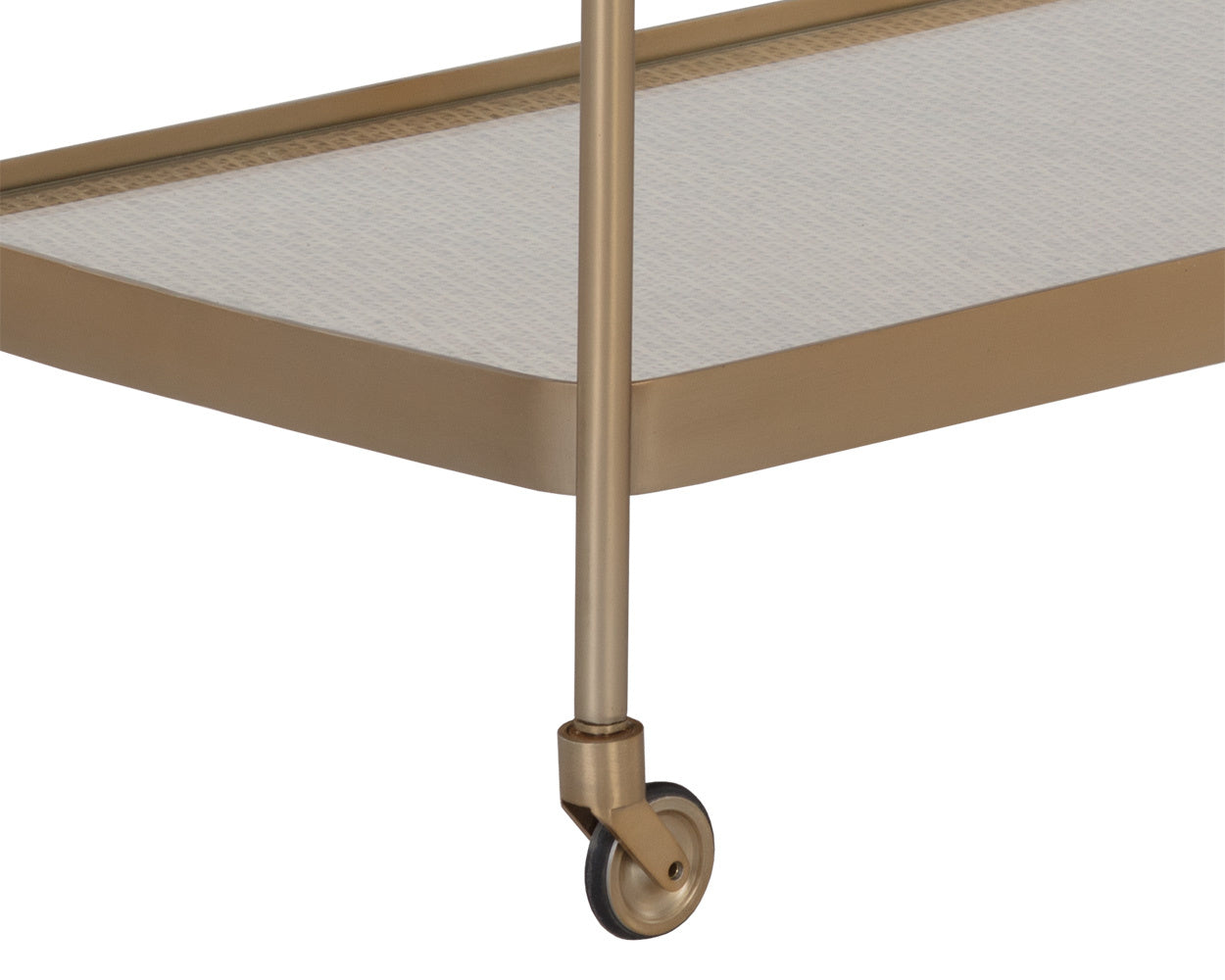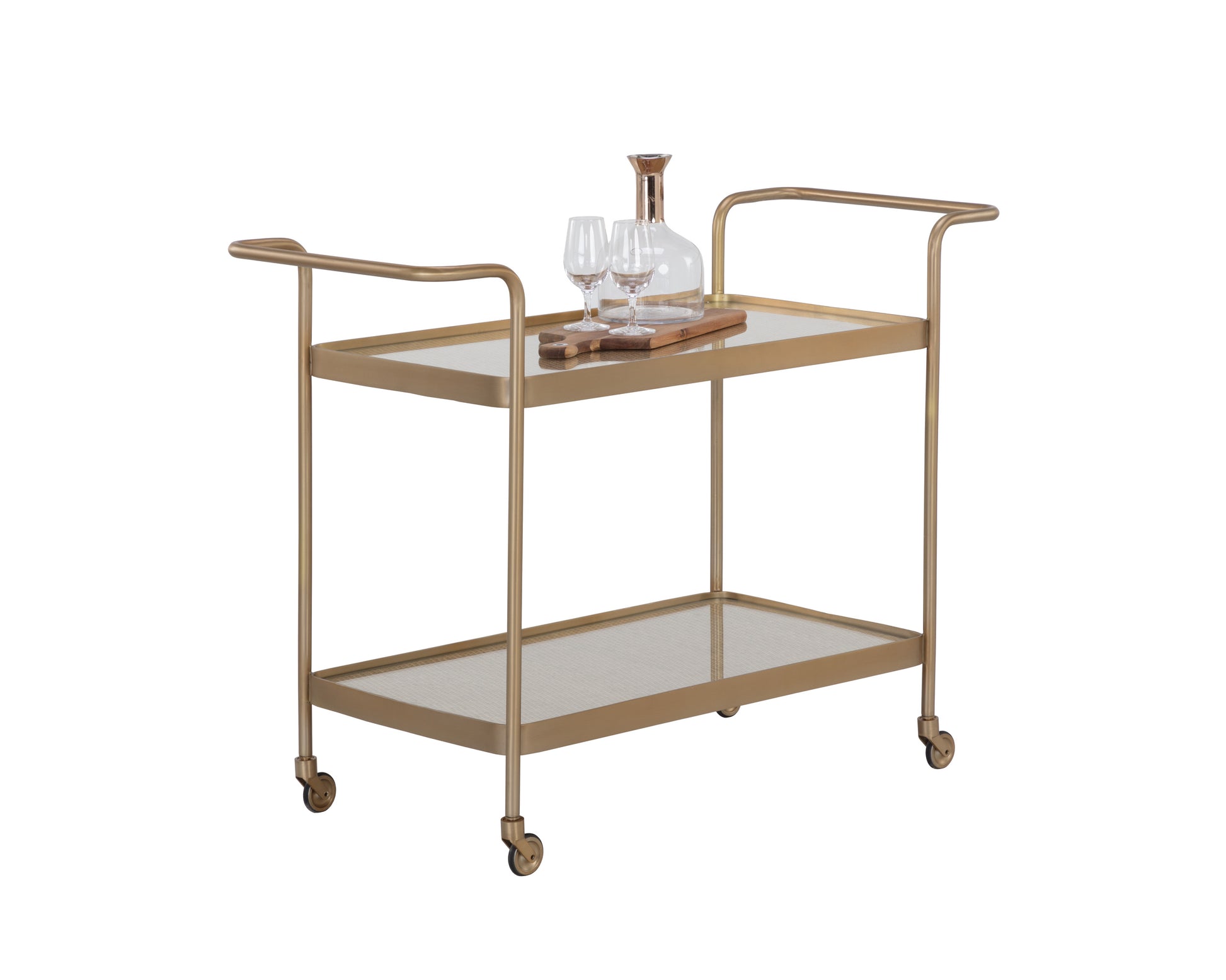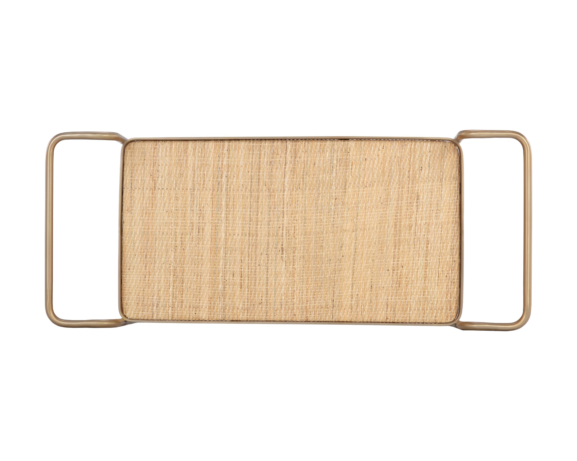 The Durva Bar Cart features a classic silhouette made from mixed materials. Clear tempered glass is placed on top of two natural rattan shelves to give the piece a relaxing coastal feel. Made in India. With refined craftsmanship, this design was brought to life by skilled local artisans. Due to the nature of handcraftsmanship, unique imperfections such as fissures, markings and variations in colour and shape are welcomed and appreciated characteristics for a truly one-of-a-kind piece.