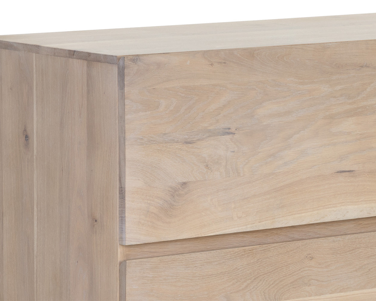 This Scandinavian-style sideboard is a tasteful addition to any dining space. Made from natural solid oak wood with a whitewash finish. Features two drawers and three cabinets for ample storage. As wood is an organic, porous material, these pieces will contain natural variation of texture and may also exhibit fine indentations and cracks. Wood pieces will also display a disparity of colour and grain, and visible knots and burls that add to the character of each piece. Made in India. With refined craftsmanship, this design was brought to life by skilled local artisans. Due to the nature of handcraftsmanship, unique imperfections such as fissures, markings and variations in colour and shape are welcomed and appreciated characteristics for a truly one-of-a-kind piece.