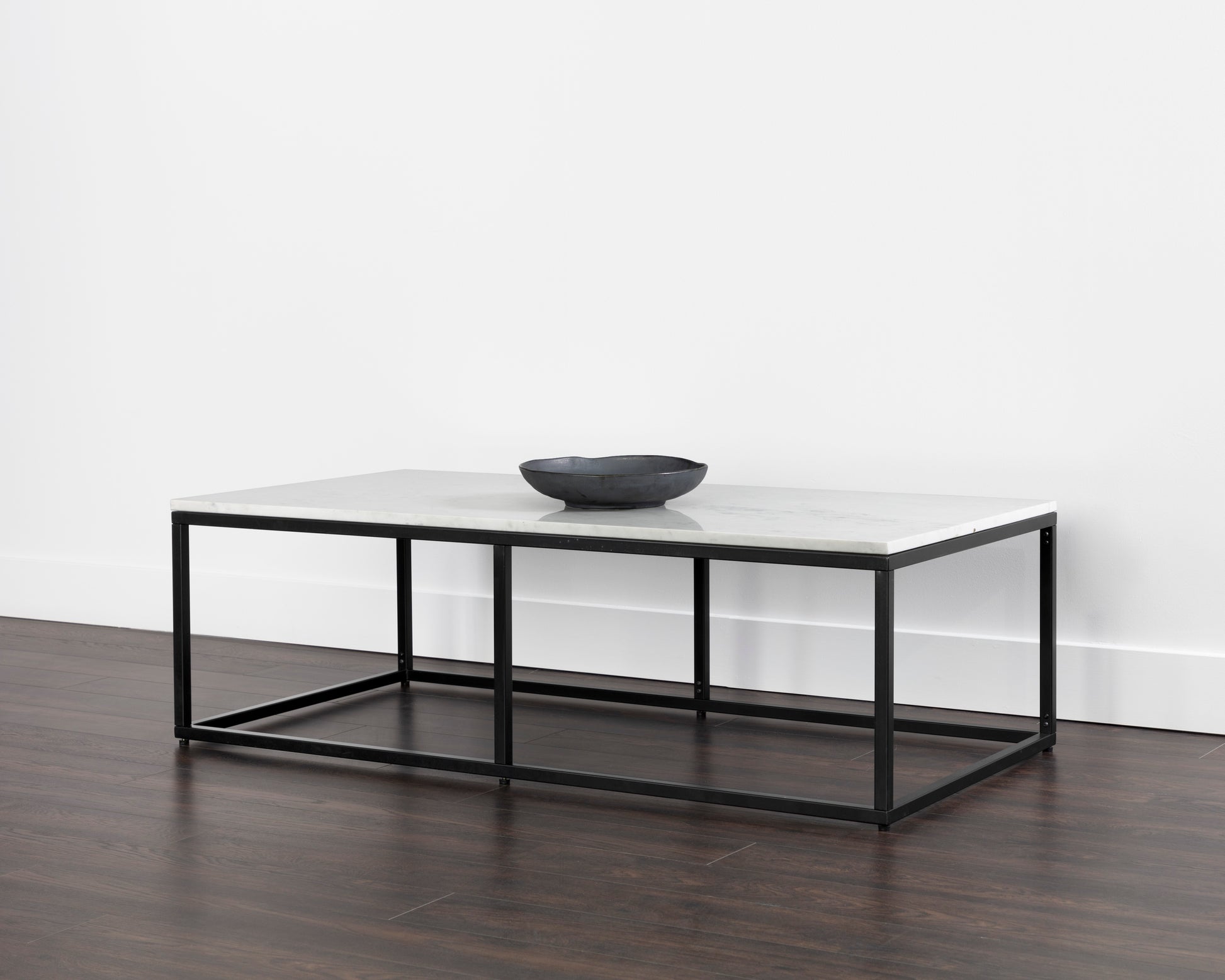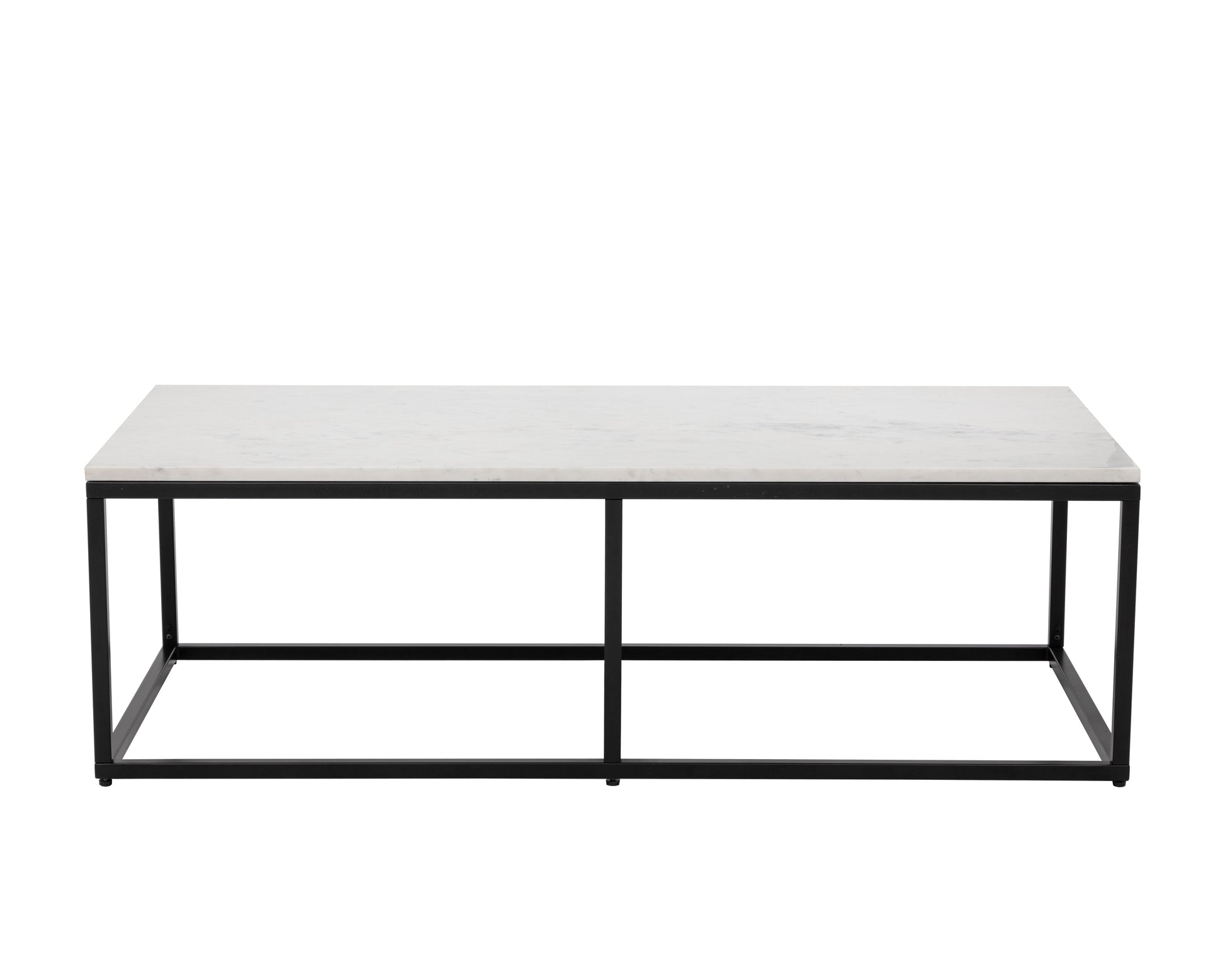With an understated design, this modern coffee table is made distinct by clean lines. Features a white polished natural marble table top with a matte black powder coated steel base. Coordinating console and end tables also available. As marble is a natural material, unique veining, pitting, fissures, micro-cracks and colour variations are all characteristics that add to the uniqueness and beauty of each piece. Made in India. With refined craftsmanship, this design was brought to life by skilled local artisans. Due to the nature of handcraftsmanship, unique imperfections such as fissures, markings and variations in colour and shape are welcomed and appreciated characteristics for a truly one-of-a-kind piece.