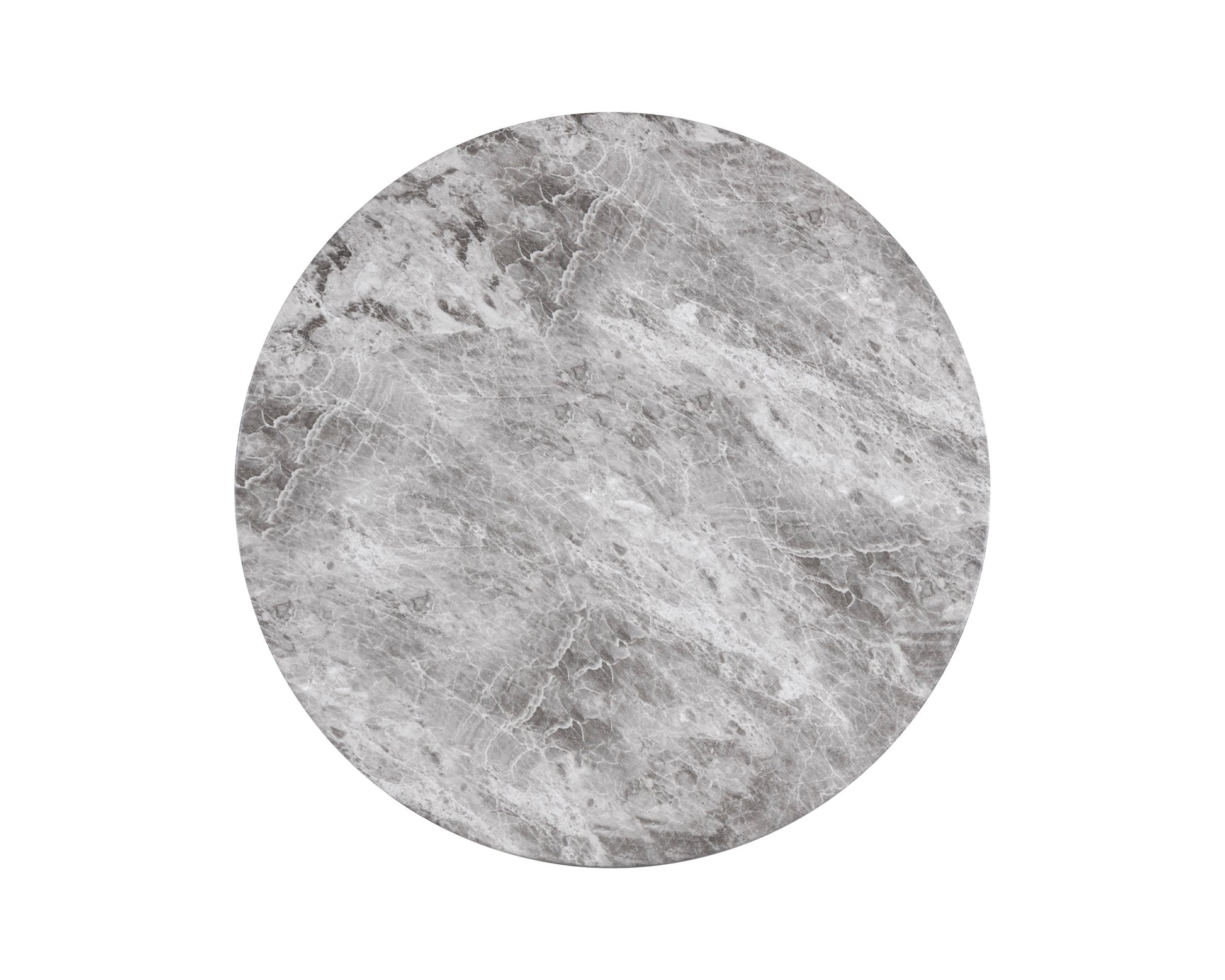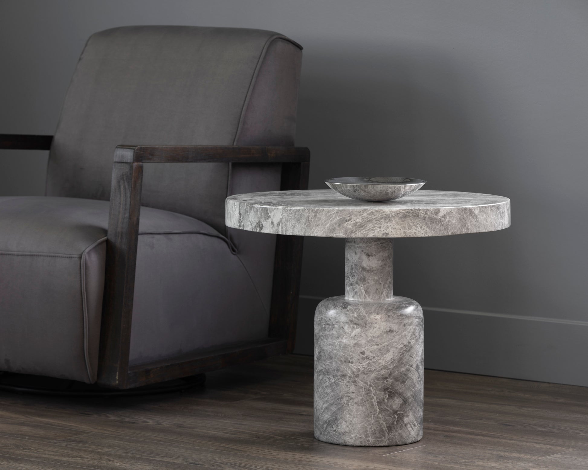 A clasically chic end table with an elegant design. Featured a round table top with a curved tabletop base in matching grey faux marble finished concrete.