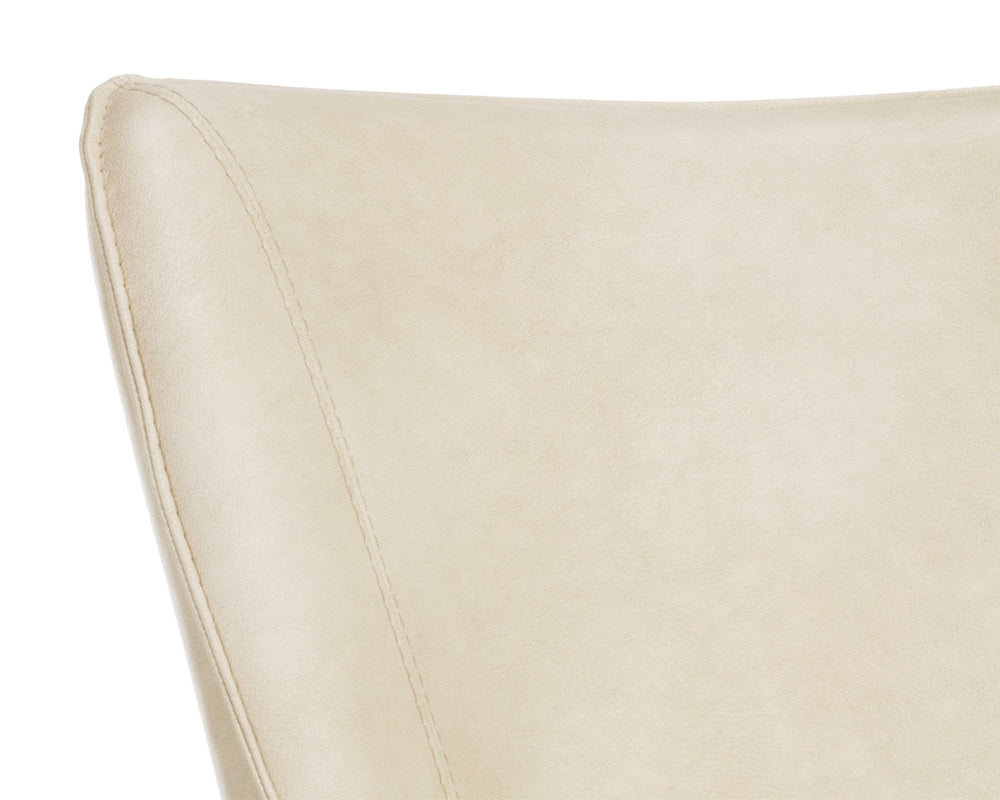 This compact barrel back dining armchair will add rustic and mid-century modern styling to dining and living spaces. Stocked in our bravo cream faux leather with antique brass steel frame and legs. Handle With Care: This design has been crafted with faux leather. Faux leather is manufactured to reflect the natural characteristics of leather; as such, colour variations, markings, wrinkles, grooves, and light scratches are appreciated characteristics. No two pieces will be alike. Visit our Product Care page for more information on how to ensure the lasting beauty of this piece.