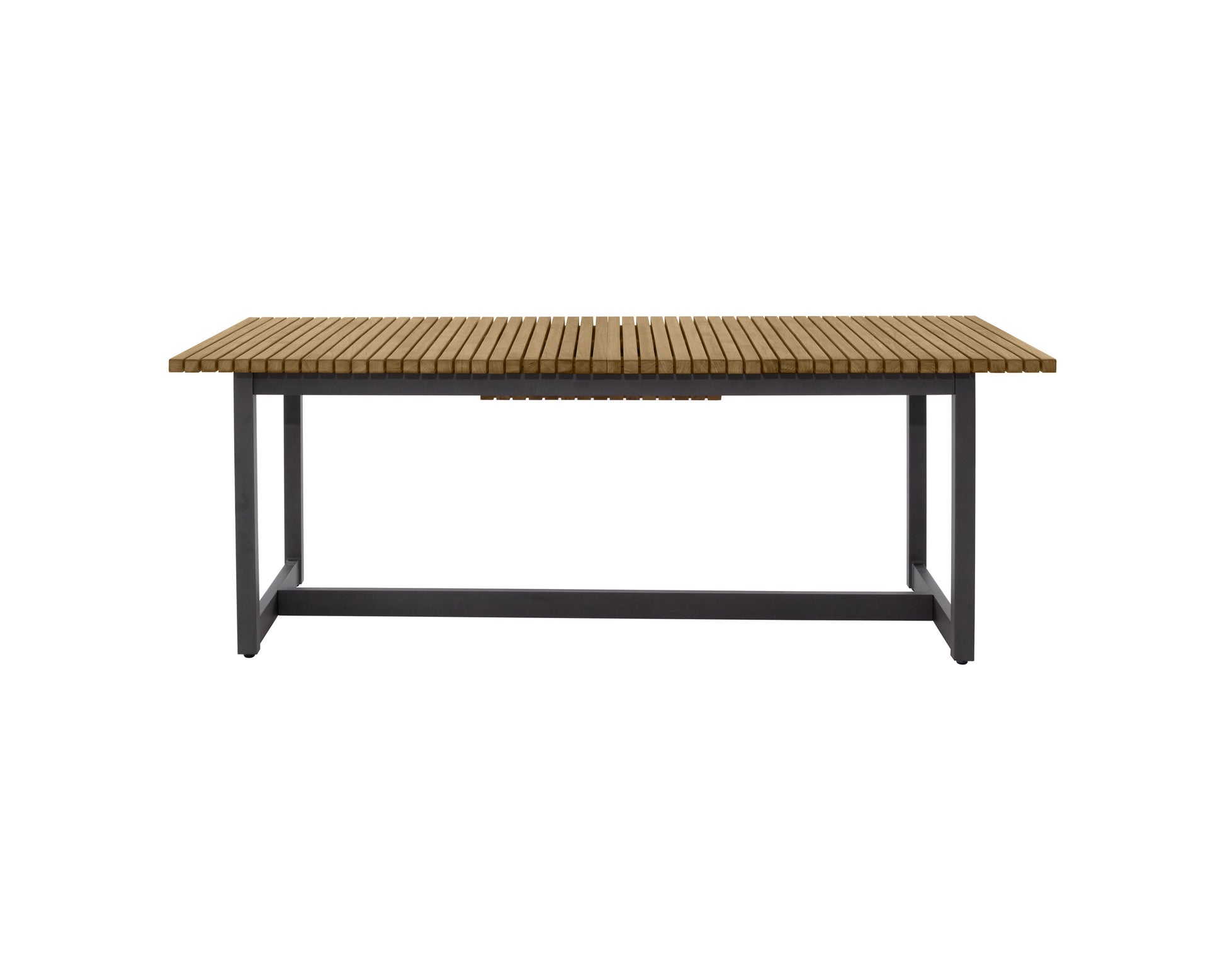 Appreciate warmth and sunlight while seated in an outdoor dining space inspired by the Arizona desert. This modern extension table features a powder-coated aluminum base with a natural teak wood top. Extends up to 104". Suitable for indoor and covered outdoor spaces.