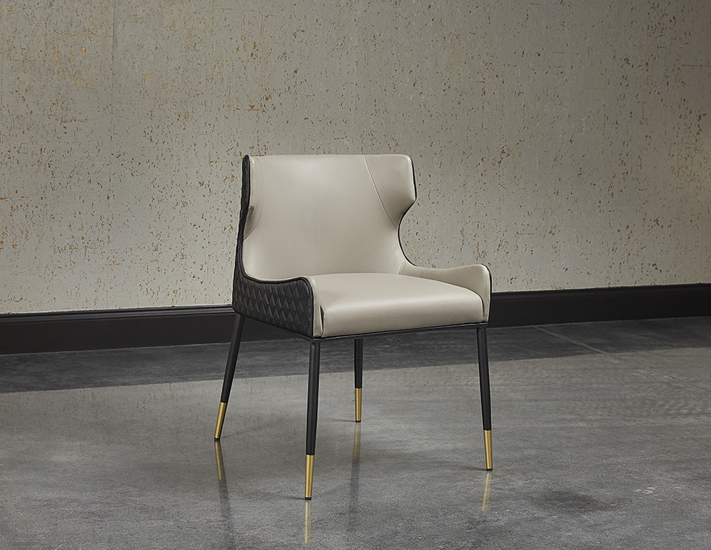 A classic dining chair featuring a substantial seat upholstered in contrasting dillon stratus and black faux leather. Diamond stitching on the seatback adds a hint of elegance while black wood legs and brushed gold foot caps complete the look. Handle With Care: This design has been crafted with faux leather. Faux leather is manufactured to reflect the natural characteristics of leather; as such, colour variations, markings, wrinkles, grooves, and light scratches are appreciated characteristics. No two pieces will be alike. Visit our Product Care page for more information on how to ensure the lasting beauty of this piece.