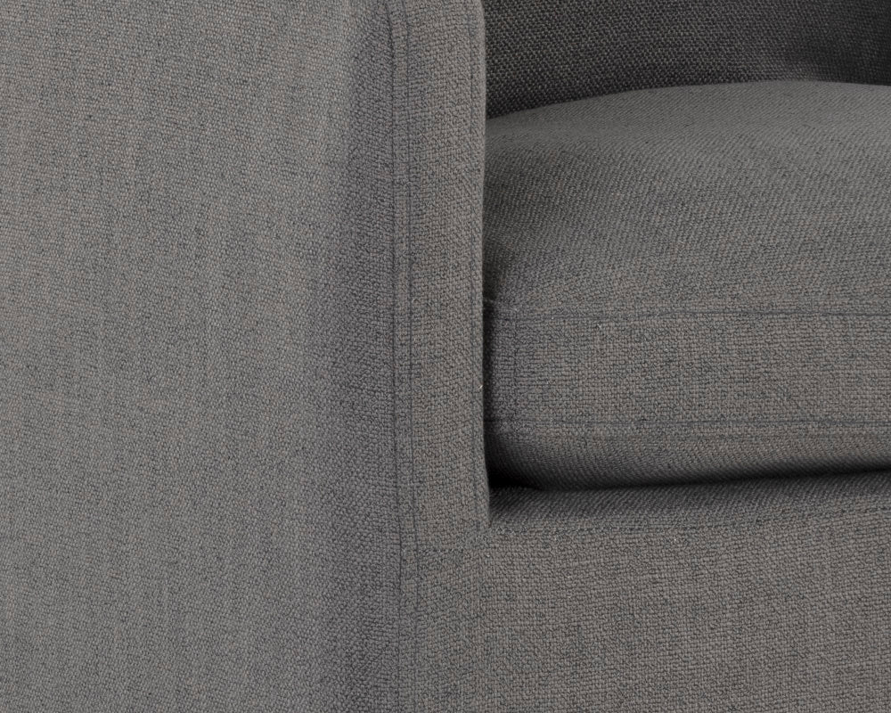 A formal and comfortable wheeled dining armchair that is full of classic appeal. Stocked in effie smoke fabric. As this piece features feather-filled cushions, occasional rotation and fluffing is required to maintain its lasting comfort and beauty. Visit our Product Care page for more information.