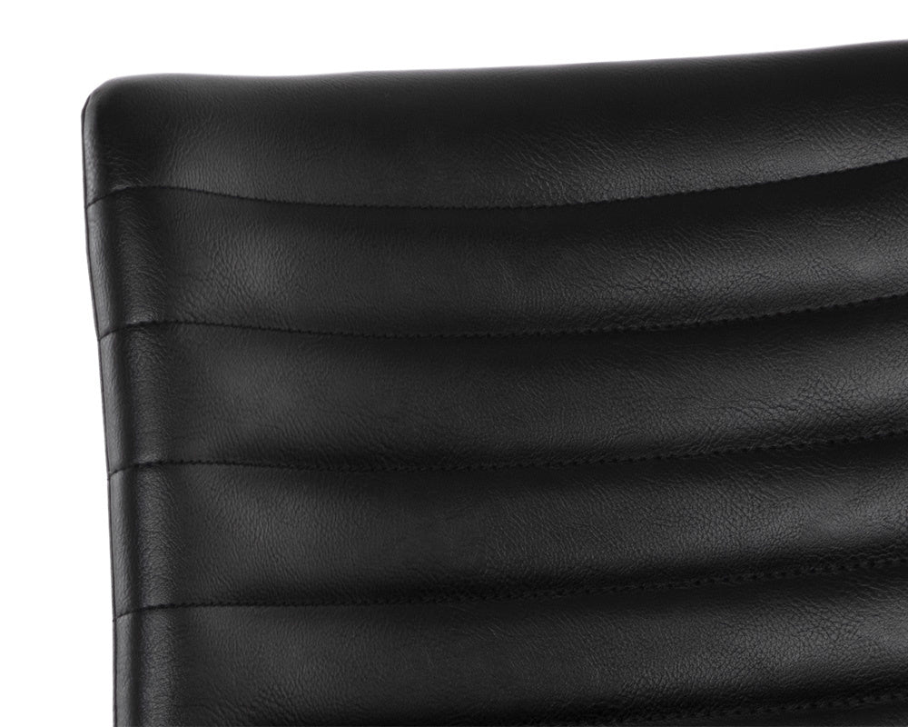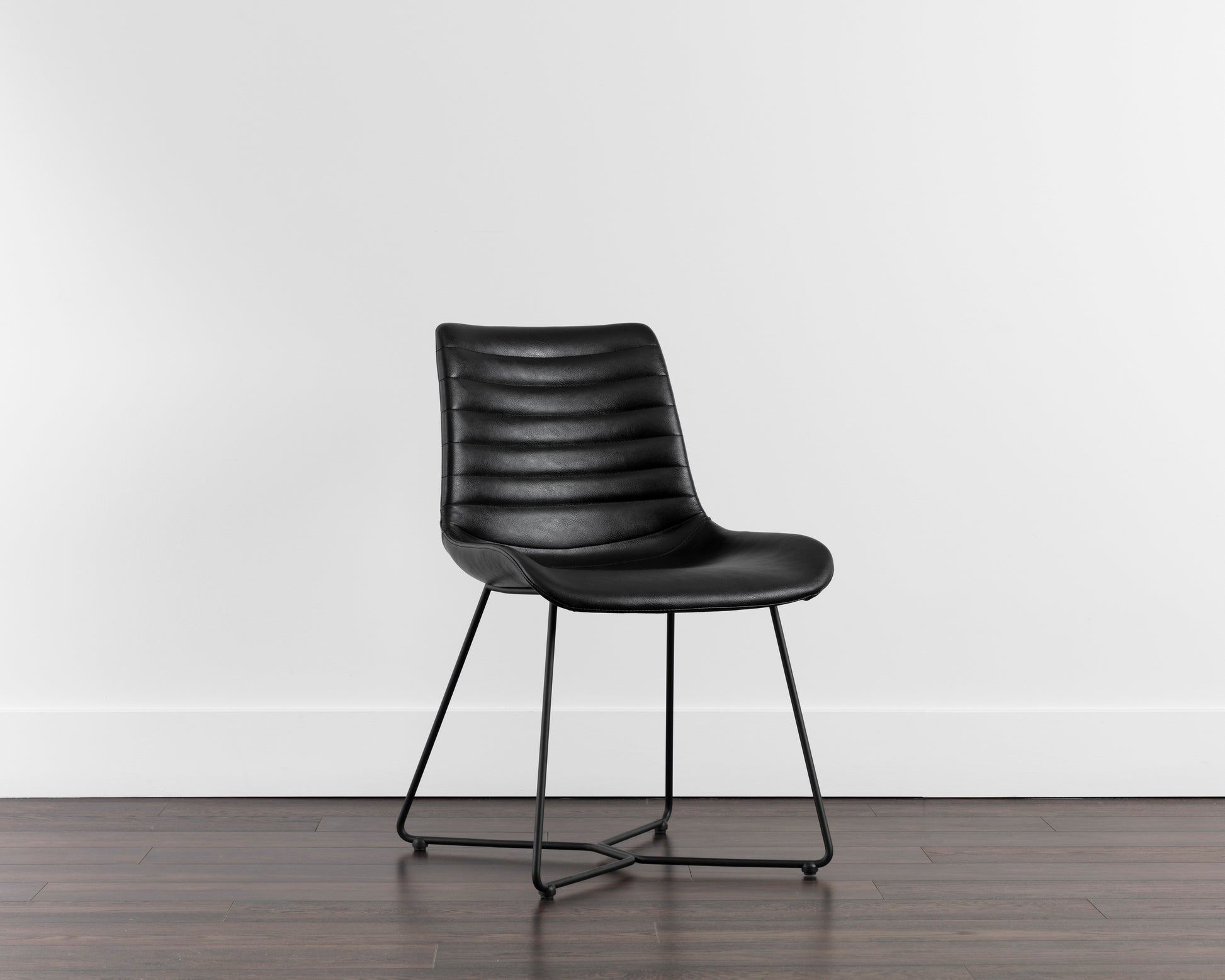 With an understated design, this minimalist dining chair demonstrates the beauty of simplicity. Stocked in nightfall black faux leather and completed with powder-coated metal legs in a matte black finish. Handle With Care: This design has been crafted with faux leather. Faux leather is manufactured to reflect the natural characteristics of leather; as such, colour variations, markings wrinkles, grooves, and light scratches are appreciated characteristics. No two pieces will be alike. Visit our Product Care page for more information on how to ensure the lasting beauty of this piece.