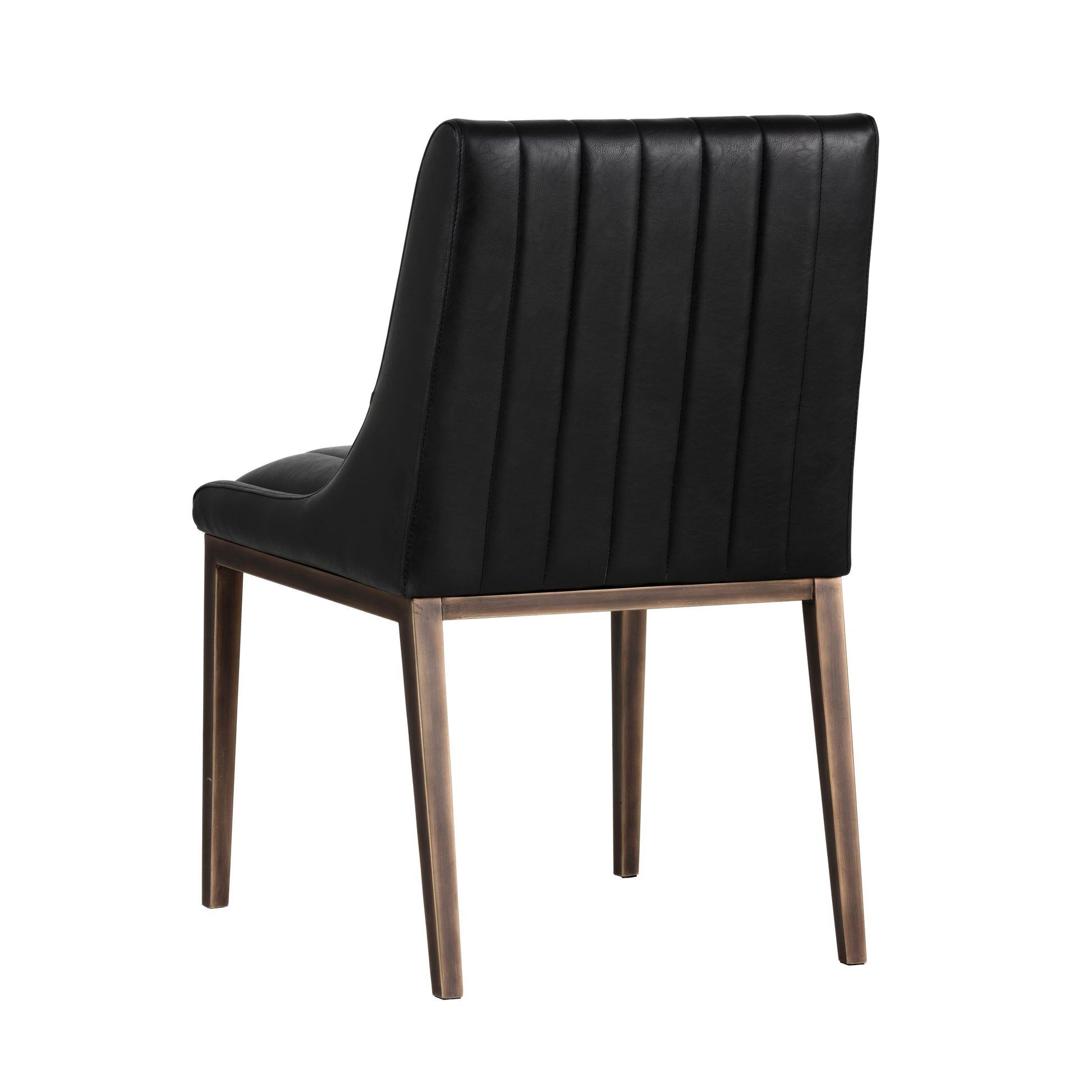 A sleek, urban designed dining chair featuring bold vertical stitching on the seat and back in masculine vintage black faux leather. Finished with a rustic bronze steel frame. Place in dining and office spaces for a retro look. Handle With Care: This design has been crafted with faux leather. Faux leather is manufactured to reflect the natural characteristics of leather; as such, colour variations, markings, wrinkles, grooves, and light scratches are appreciated characteristics. No two pieces will be alike. Visit our Product Care page for more information on how to ensure the lasting beauty of this piece.